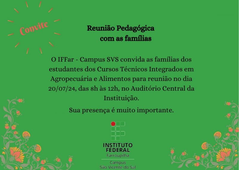 A Direção de Ensino do Instituto Federal Farroupilha - Campus São Vicente do Sul convida pais, mães e/ou responsáveis dos(as) alunos(as) dos Cursos Técnicos Integrados em Alimentos e Agropecuária para Reunião Pedagógica.