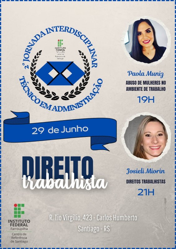 Os estudantes e professores do I semestre do Curso Técnico em Administração Subsequente do Instituto Federal Farroupilha Campus Jaguari/ Centro de Referência de Santiago convidam colegas, professores, servidores, administradores, gestores ou interessados nas temáticas, a participar da 2ª Jornada de Estudos Interdisciplinares do Curso Técnico em Administração, a realizar-se nos dias 29 e 30 de junho no Centro de Referência de Santiago a partir das 19 horas.