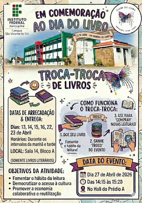 Em comemoração ao Dia do Livro, o Troca-Troca de Livros acontecerá no Campus São Vicente do Sul do Instituto Federal Farroupilha, convidando a comunidade escolar e acadêmica a participar de um momento de partilha, descoberta e circulação de histórias. A iniciativa busca estimular o hábito da leitura, ampliar o acesso a obras literárias e incentivar o reaproveitamento de livros por meio da troca entre leitores.