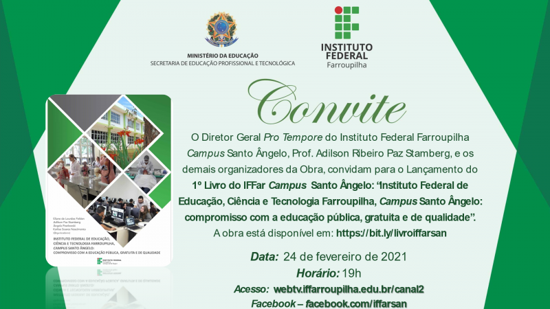 O Diretor Geral Pro Tempore do Instituto Federal Farroupilha Campus Santo Ângelo, Prof. Adilson Ribeiro Paz Stamberg, e os demais organizadores da Obra, convidam para o Lançamento do 1º Livro do IFFar Campus Santo Ângelo: “Instituto Federal de Educação, Ciência e Tecnologia Farroupilha, Campus Santo Ângelo: compromisso com a educação pública, gratuita e de qualidade”.