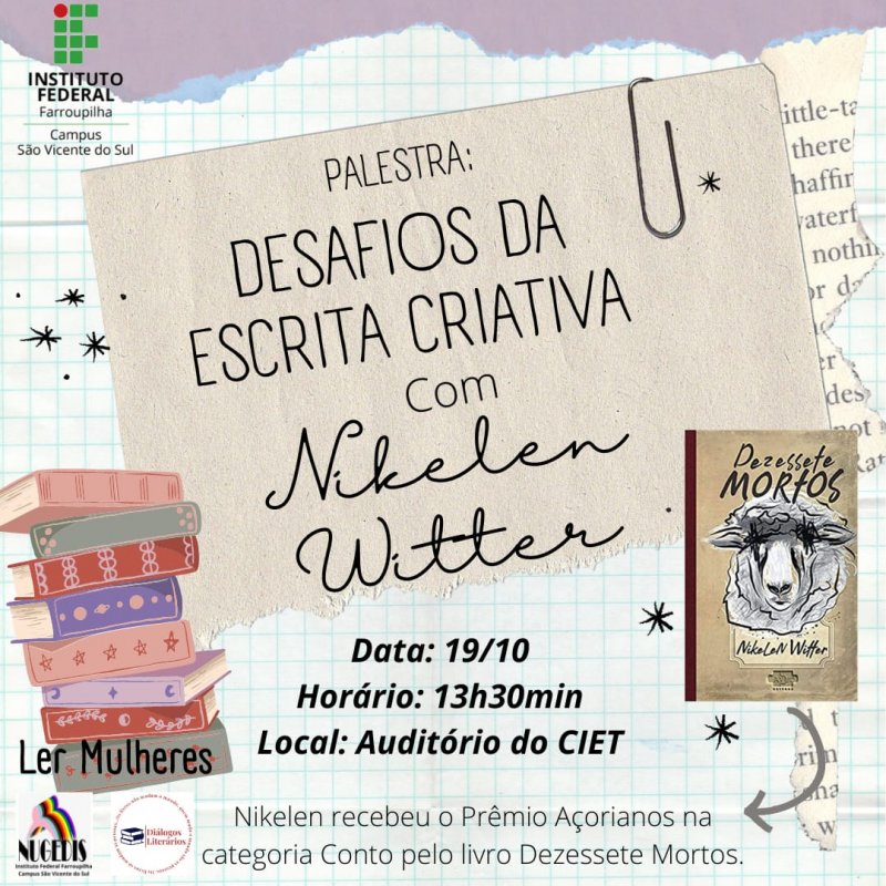Na quarta-feira, dia 19/10, haverá a Palestra Desafios da Escrita Criativa, com a escritora Nikelen Witter vencedora do prêmio Açorianos em 2021, com a obra “Dezessete Mortos”.