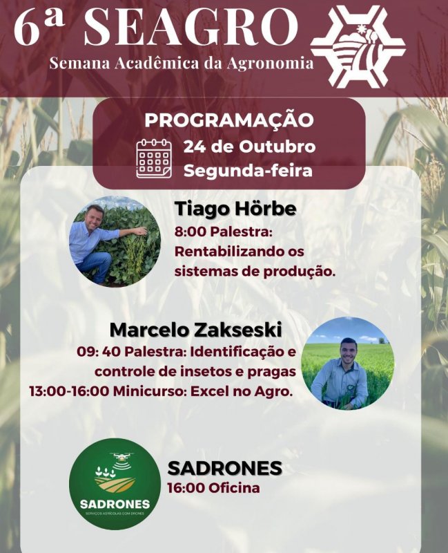 De 24 a 27 de outubro, acontece, no Instituto Federal Farroupilha - Campus São Vicente do Sul, a 6ª edição da Semana Acadêmica do Curso de Agronomia (SEAGRO). A programação envolve palestras, oficinas e minicursos sobre assuntos diversos e tem como tema “Semeando Ideias, cultivando saberes e colhendo sucesso”. Confira abaixo: