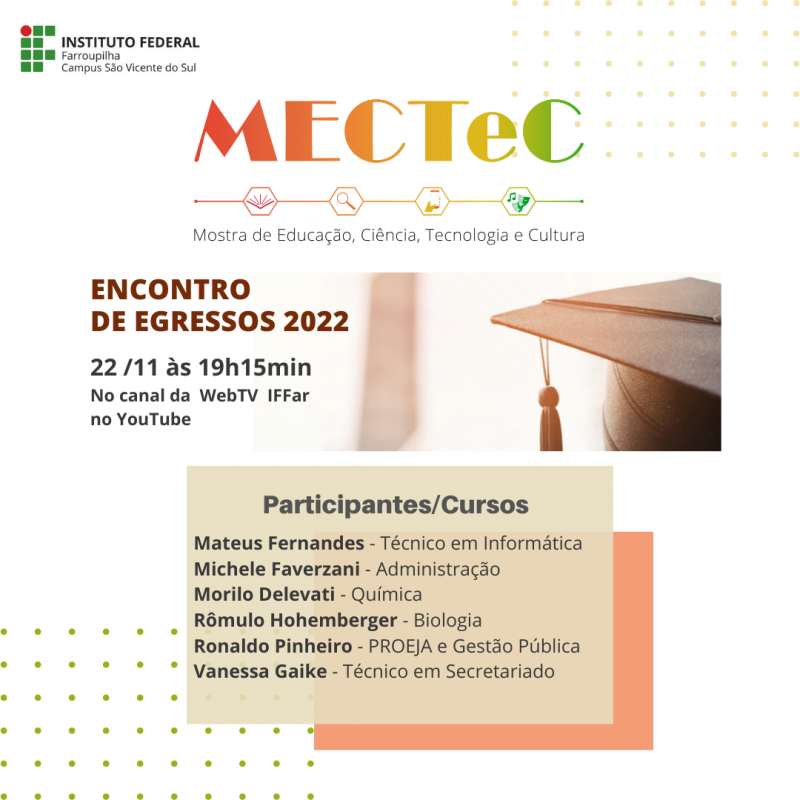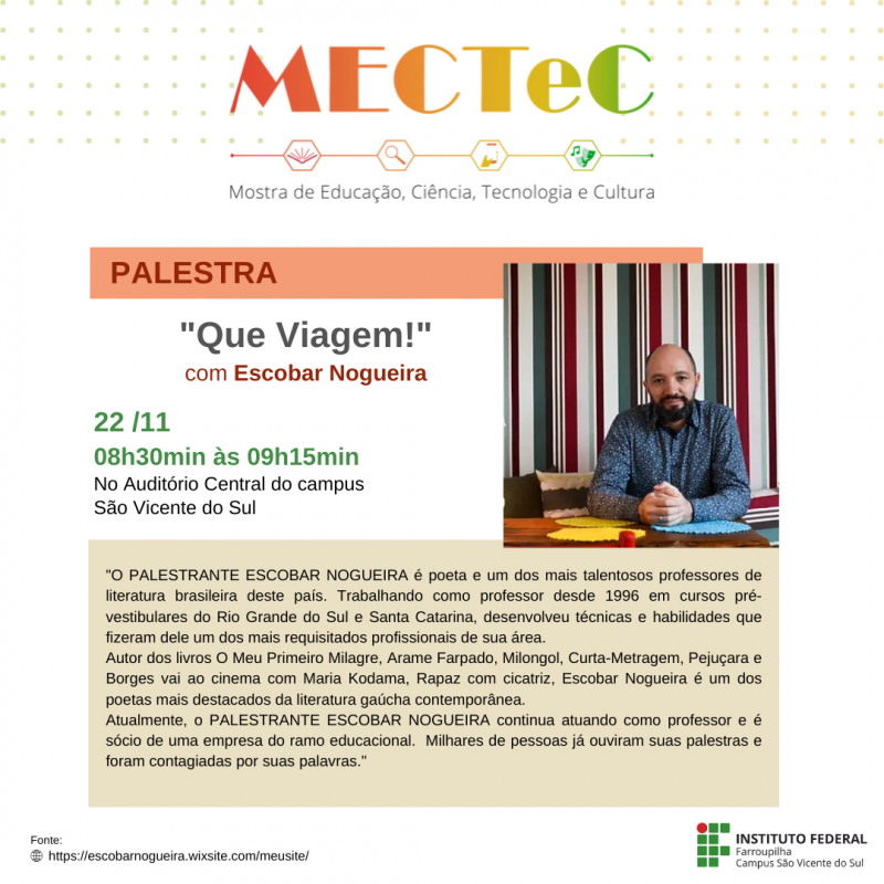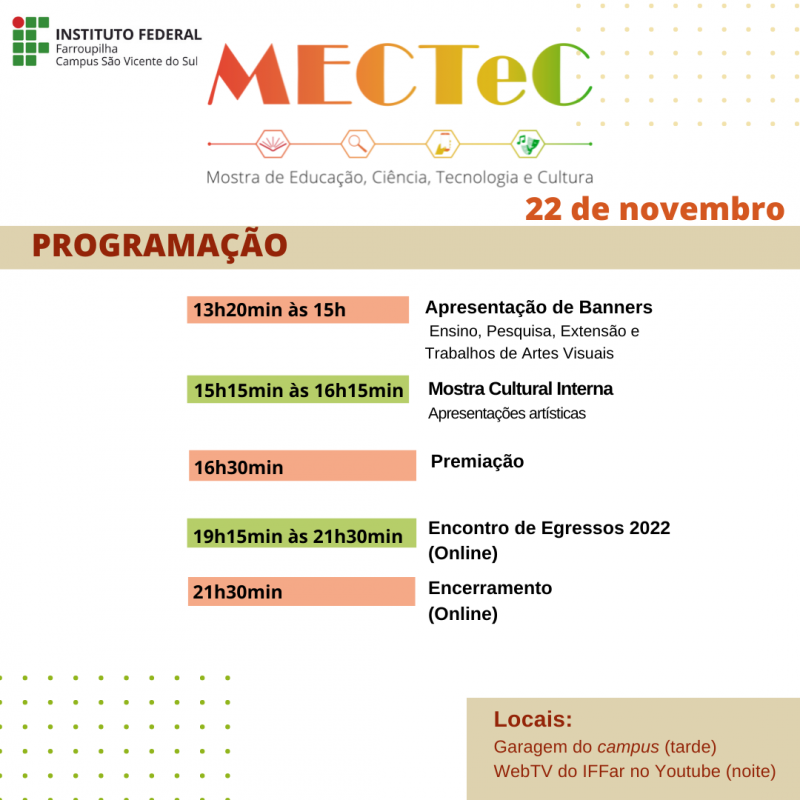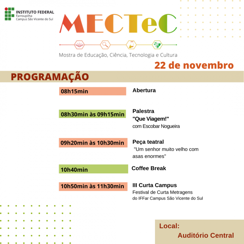 Página inicial > Eventos Institucionais > MECTeC: Mostra de Educação, Ciência, Tecnologia e Cultura do Campus SVS