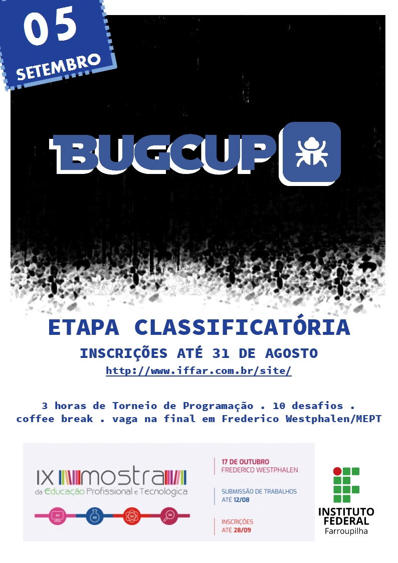 BUGCUP é um Torneio de Programação voltado para alunos da área de informática do IFFar, e tem por objetivo verificar a capacidade dos participantes em depurar códigos de programas, encontrar possíveis bugs e determinar uma solução.