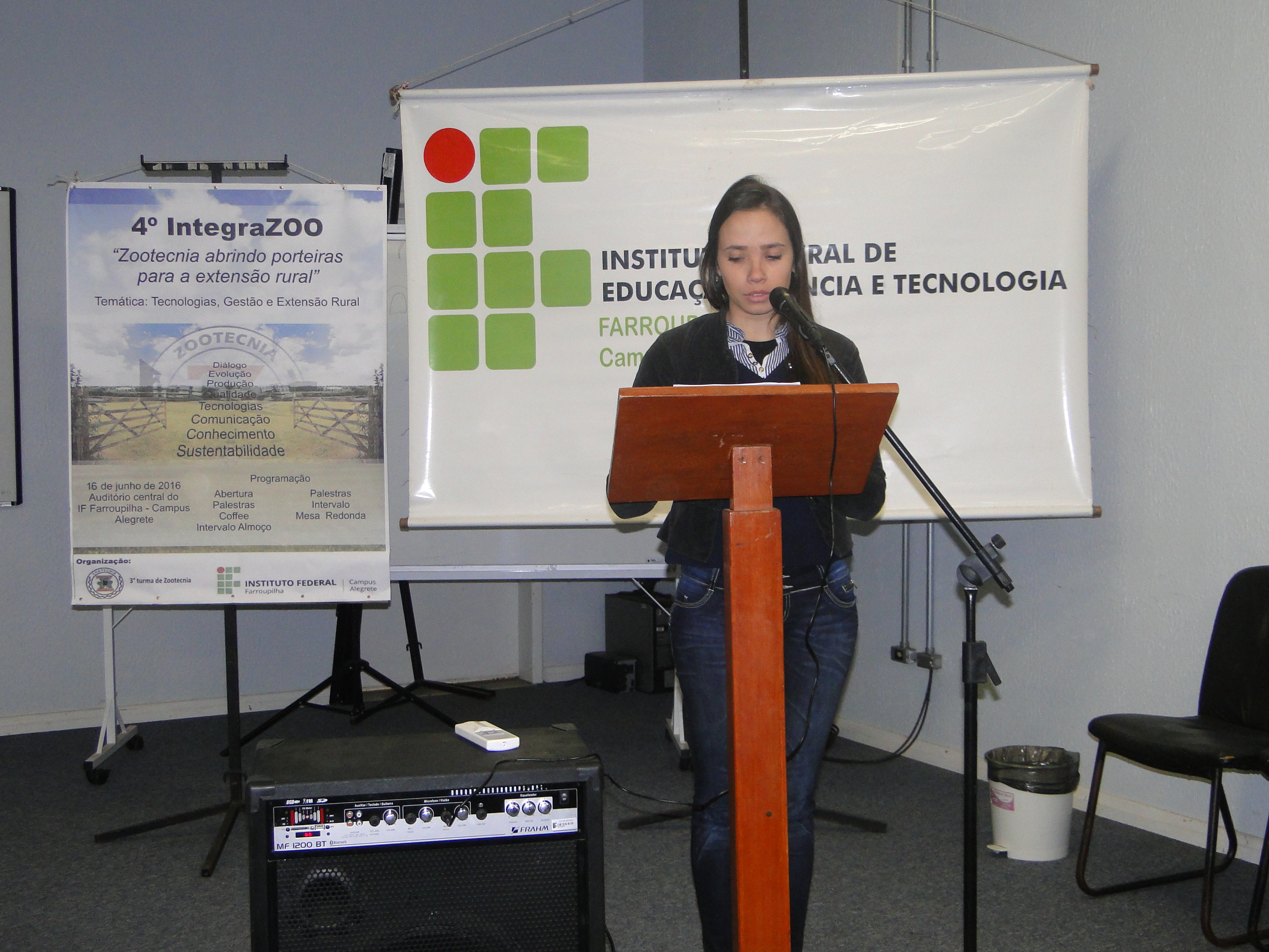 A abertura do IV IntegraZOO contou com a presença da Diretora Geral do Campus Alegrete, Ana Paula Ribeiro; da Diretora de Ensino, Joseane Erbice; e da Coordenadora do Curso de Zootecnia, Prof. Anna Carolina Confortin.