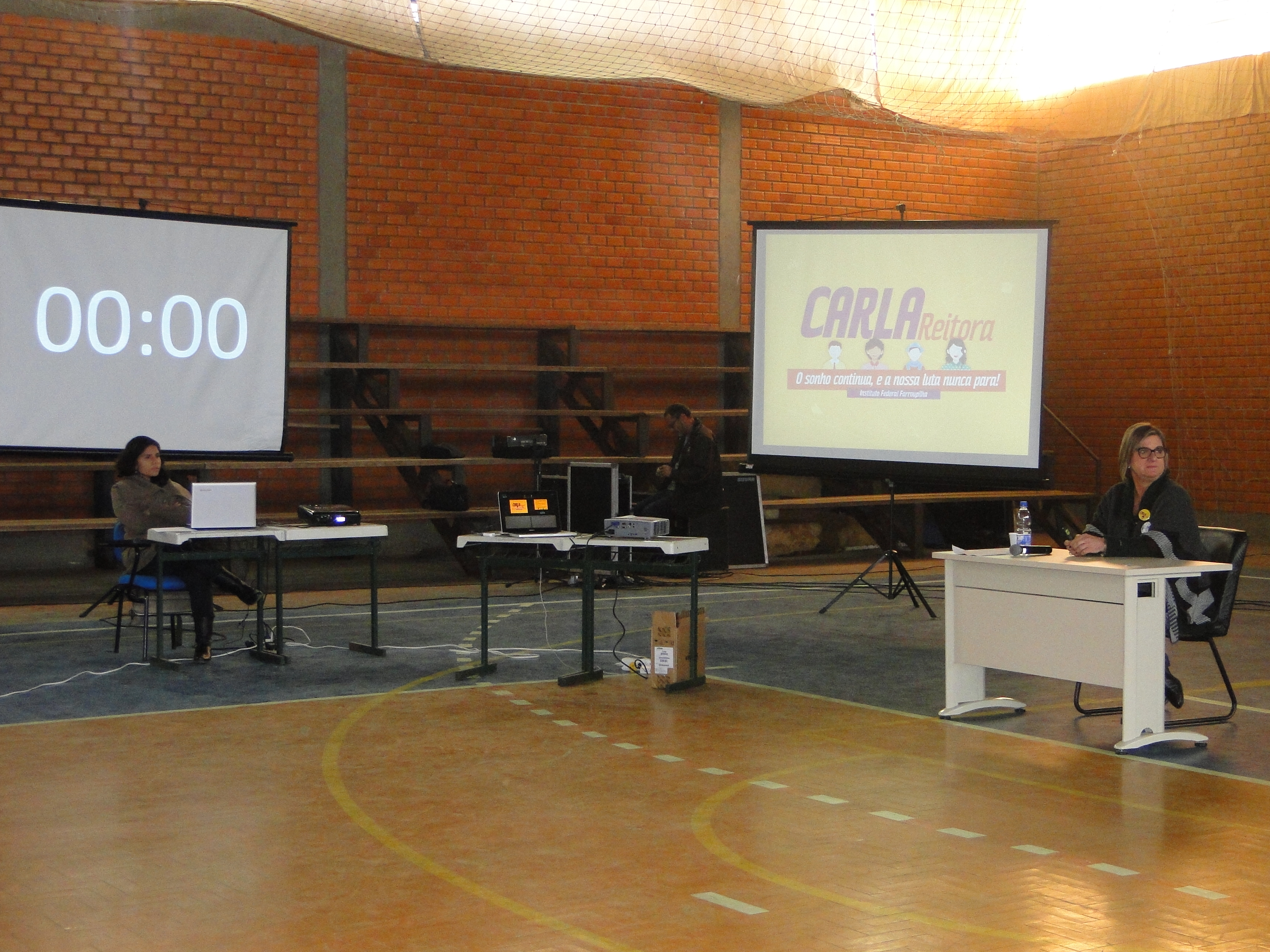 A explanação foi dividida, pela comissão eleitoral, em três etapas: apresentação do plano, perguntas do público (quatro questões de cada segmento: discente, docente e técnico-administrativo) e considerações finais. Nos minutos iniciais e finais, Carla falou sobre o andamento da atual gestão: o que foi feito e o que ficou para os próximos quatro anos. Logo, a candidata explanou sobre os cinco eixos os quais dividiu sua campanha: