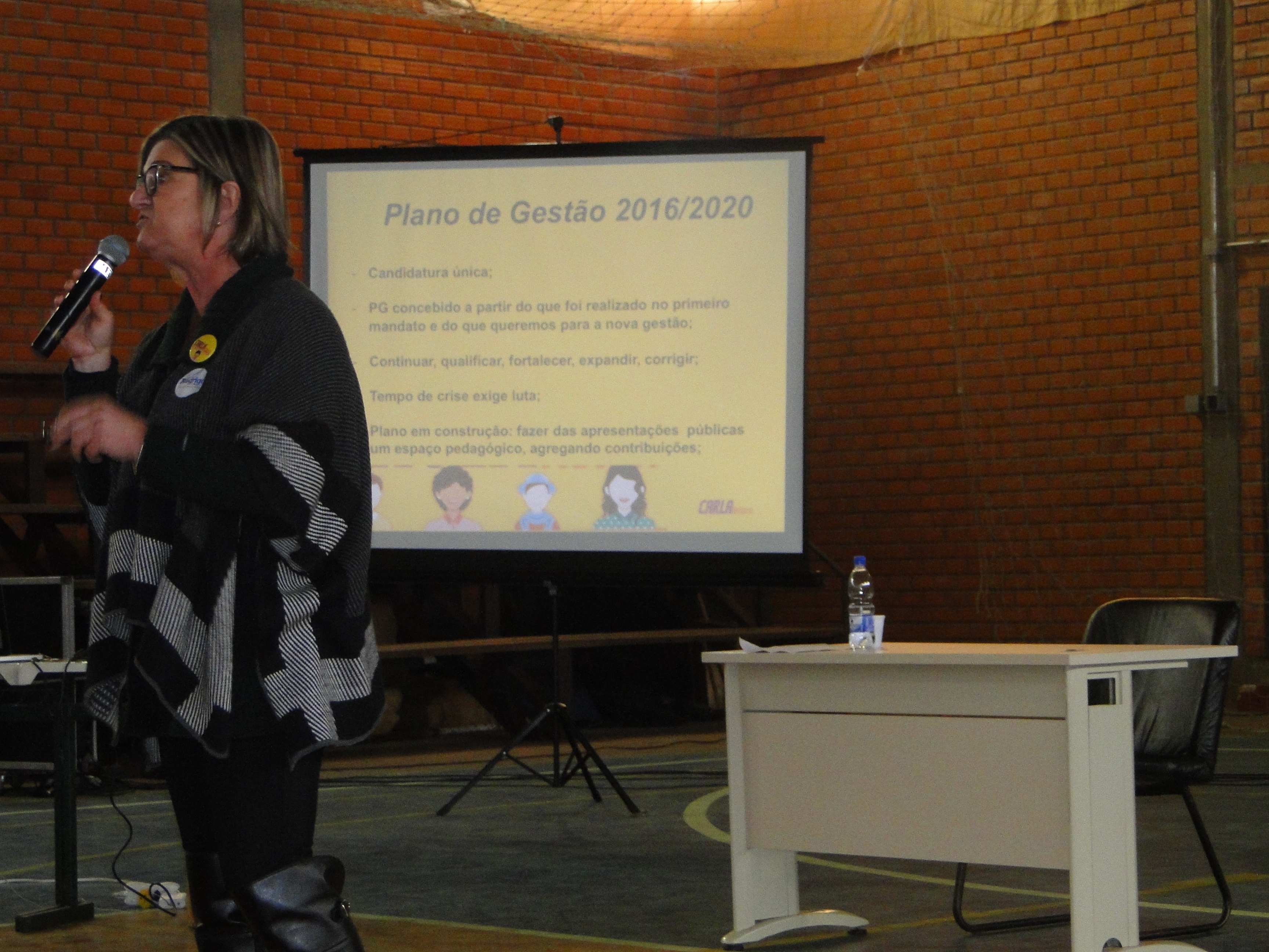Ontem, durante dois momentos – tarde e noite – no Ginásio de Esportes, a atual Reitora e candidata única à próxima gestão da Reitoria do IF Farroupilha (2016-2020), Carla Comerlato Jardim, expôs seu plano de ações aos alunos e servidores do Campus Alegrete.