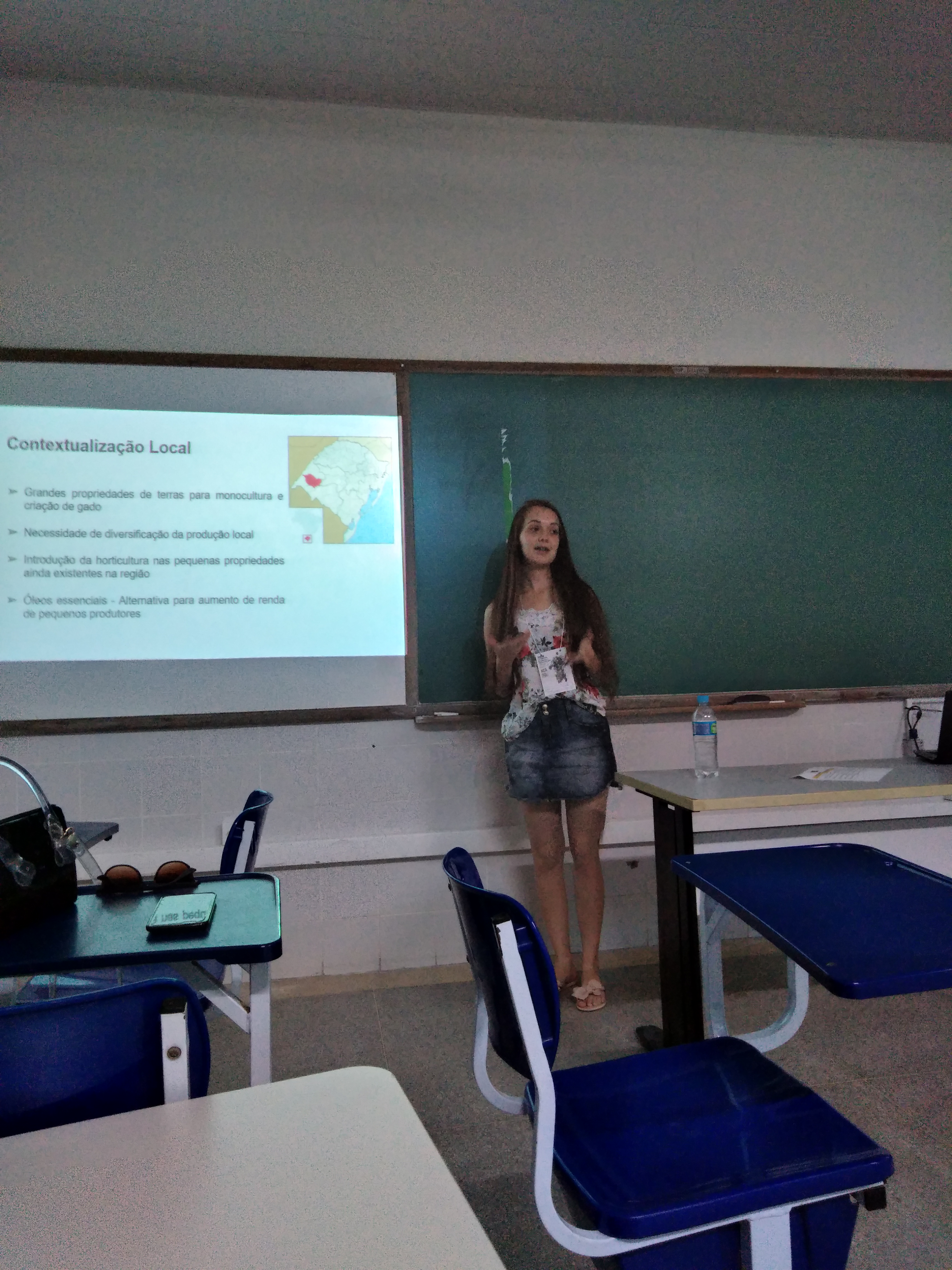 Foram apresentados alguns resultados do projeto de extensão “Mãos à horta - experiência de implantação de hortas escolares pelos alunos do IFFar- Campus Alegrete”, e do projeto de pesquisa "Avaliação do rendimento de extração de óleo essencial de capim cidreira (Cymbopogon citratus) fresco e congelado".