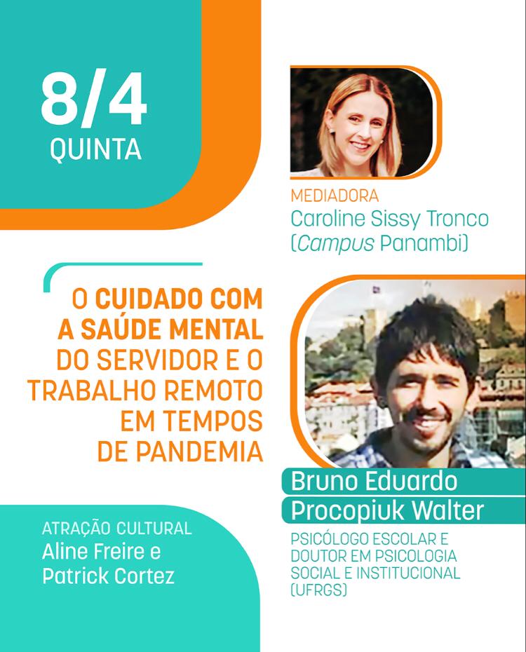 No dia 08 de abril, às 19h, a atração cultural ficará por conta dos cantores Aline Freire e Patrick Cortez. Neste dia, haverá duas palestras. A primeira, com o tema "O cuidado com a saúde mental do servidor e o trabalho remoto em tempos de pandemia", será feita pelo psicólogo escolar e Doutor em Psicologia Social e Institucional pela UFRGS, Bruno Eduardo Procopiuk Walter. A mediação será feita pela servidora do Campus Panambi, Caroline Sissy Tronco. A segunda palestra contará com a presença de Monique Melo, pedagoga e facilitadora em Comunicação Não-Violenta, e Ariane Osshiro, administradora e consultora na área de resolução de conflitos. As convidadas irão falar sobre o tema "Sentimentos e necessidades: como acolher em meio à pandemia? Uma perspectiva da Comunicação Não-Violenta".