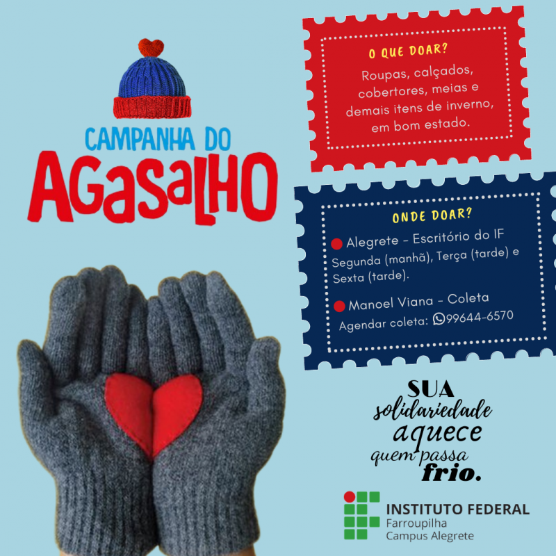 A campanha deste ano vai até o dia 25 de junho, visto que a previsão do tempo marca muito frio para os próximos meses. Por não haver expediente presencial no campus, o único ponto de coleta esse ano, em Alegrete, será o Escritório do Instituto Federal Farroupilha, localizado na Rua Venâncio Aires, 822 (esquina com a Rua dos Andradas). Confira os dias e horários que o escritório estará aberto para coleta: segunda (manhã), terça (tarde) e sexta (tarde). Em Manoel Viana, a coleta será feita pela Diretora do Campus, Ana Rita Parizi. Para doar, basta chamar no whatsapp e agendar a coleta: (55) 99644-6570.