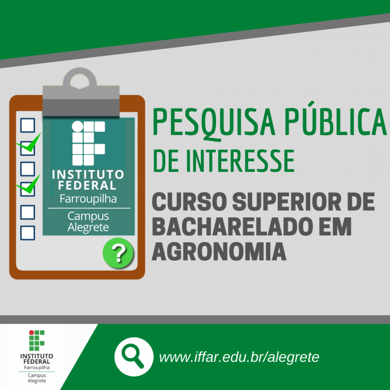 O Instituto Federal Farroupilha - Campus Alegrete está promovendo até o dia 02 de julho, pesquisa pública de interesse para a criação de um novo curso no campus - Curso Superior de Bacharelado em Agronomia.