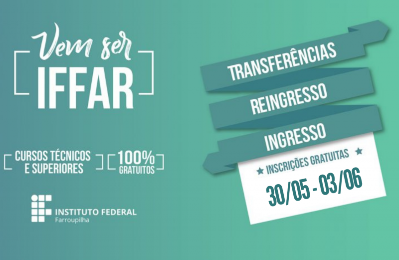 As inscrições para o Edital de Reingresso, Transferências e Portador de Diploma do IFFar vão de 30 de maio a 03 de junho. O processo oportuniza o ingresso no IFFar a partir do preenchimento das vagas remanescentes em cursos técnicos e superiores.
