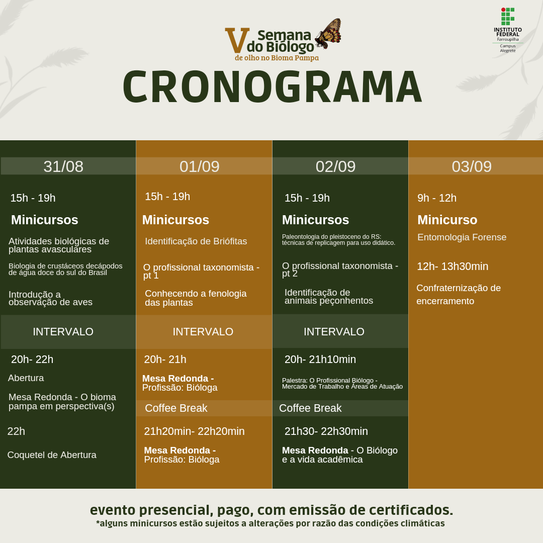 O evento tem como objetivo contribuir com a formação e a capacitação de acadêmicos e profissionais da área das Ciências Biológicas para atuar na sociedade de modo mais consciente e propositivo dentro do Bioma Pampa.