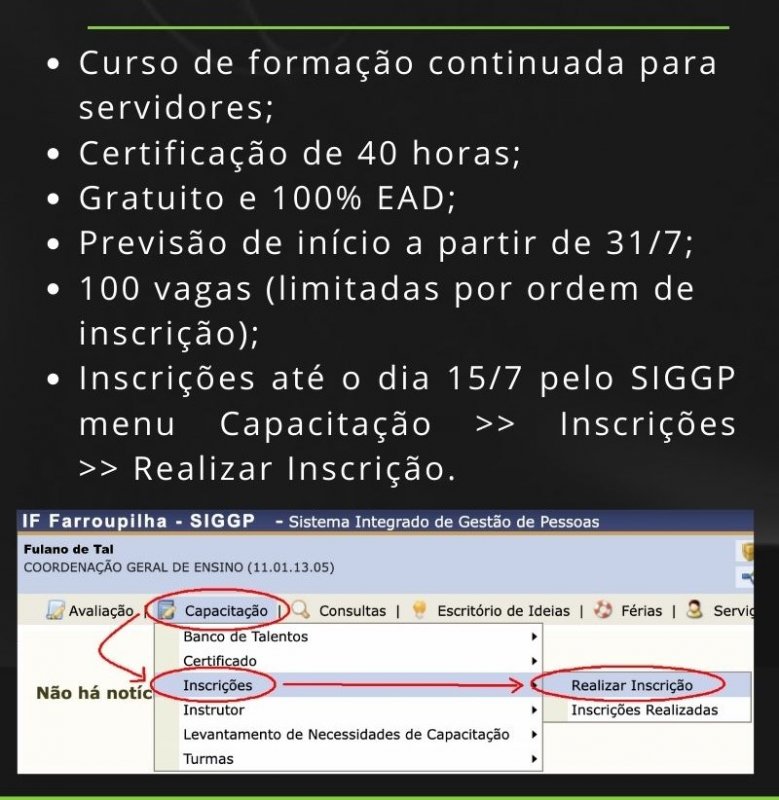 A carga horária é de 40 horas, sendo desenvolvido na plataforma Moodle. A inscrição deve ser realizada diretamente no SIGGP no menu