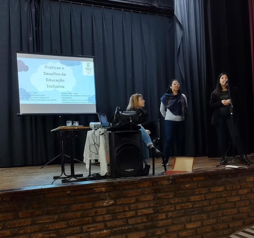 A temática da palestra expositiva-dialogada foi "Práticas e desafios da Educação Inclusiva", ministrada por Mariele da Silva Vieira, Tradutora e Intérprete de Libras e Coordenadora de Apoio à Pessoas com Necessidades Educacionais Específicas (CAPNE), e Michele Lopes Leguiça, Professora de Atendimento Educacional Especializado e Membro do Núcleo de Apoio à Pessoas com Necessidades Educacionais Específicas (NAPNE), ambas do IFFar - Campus Alegrete.