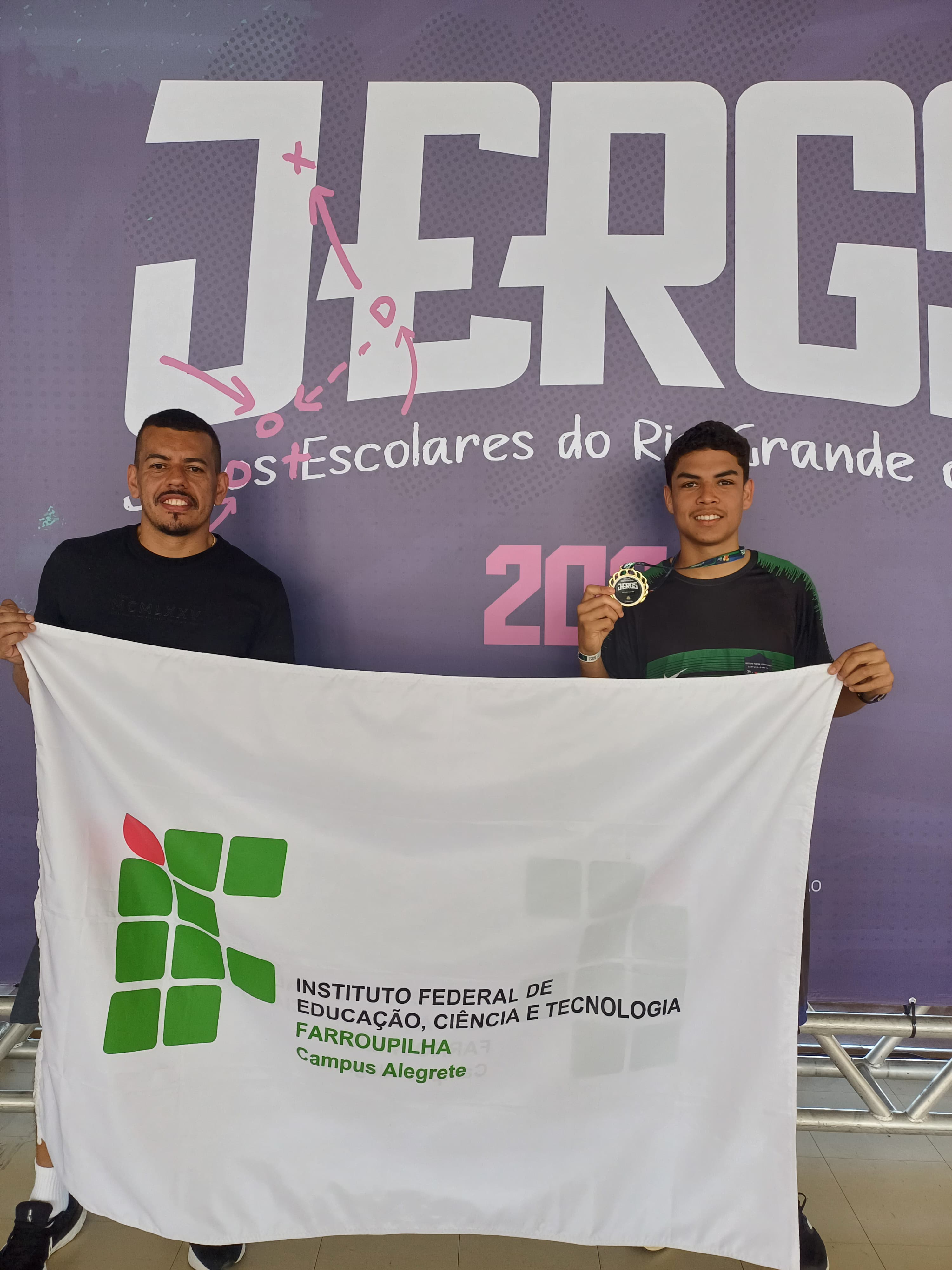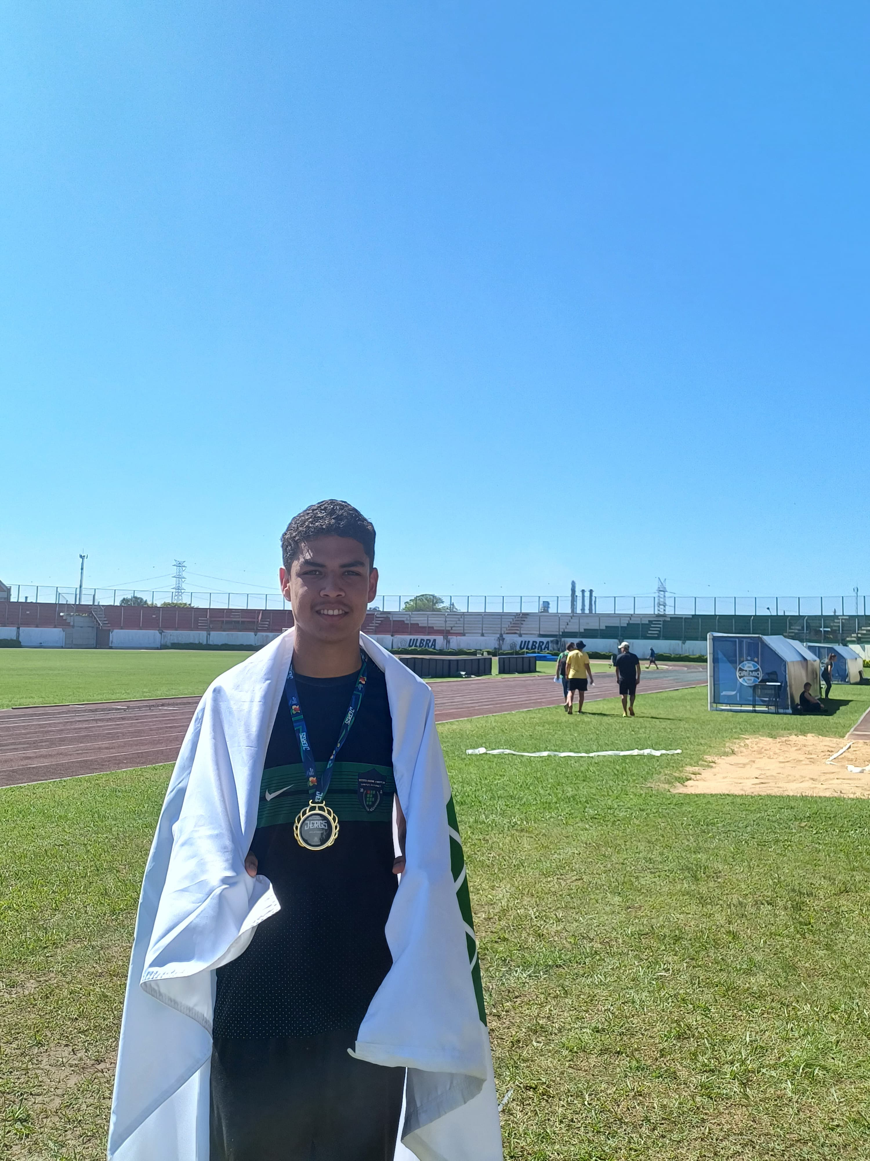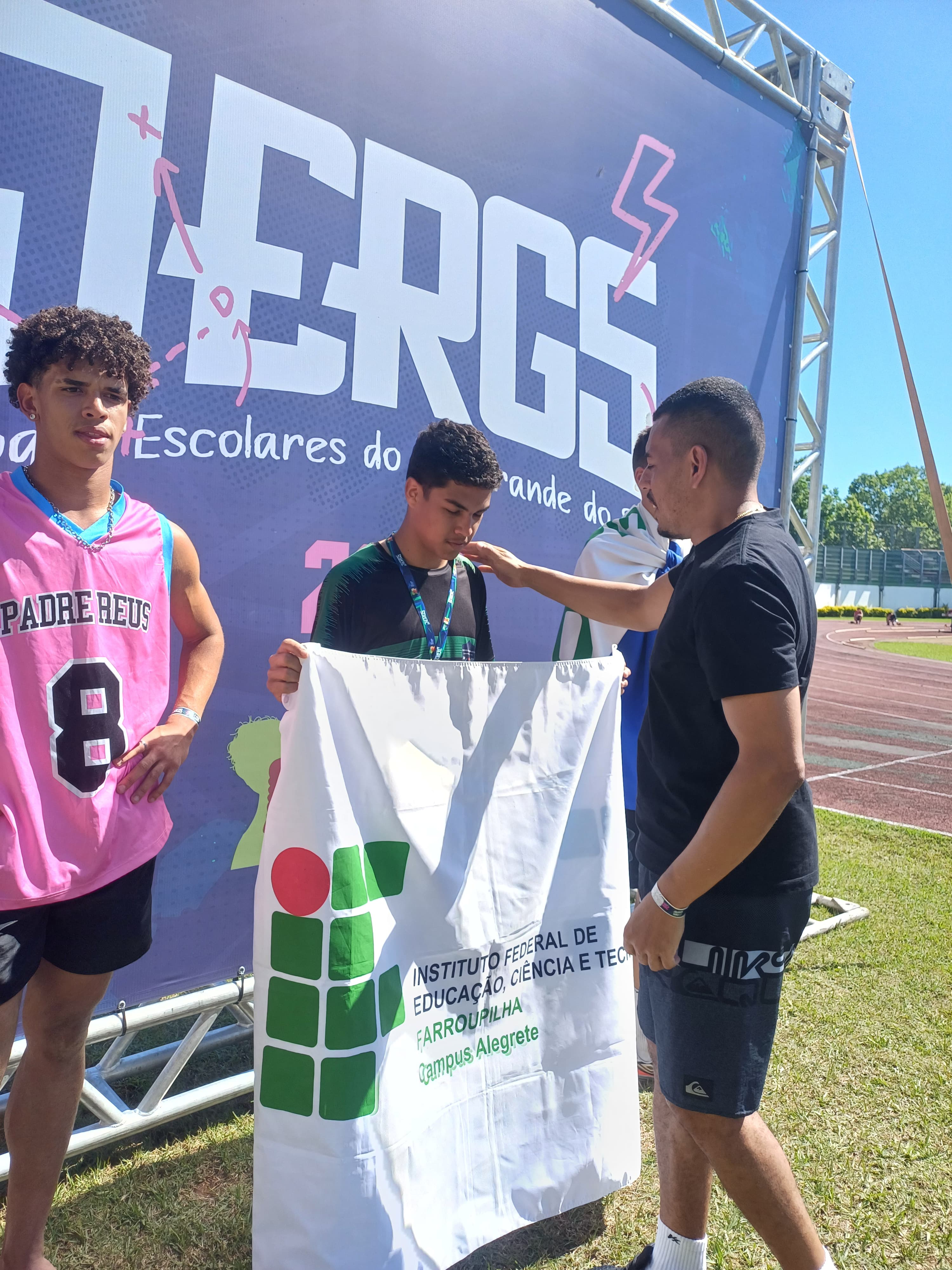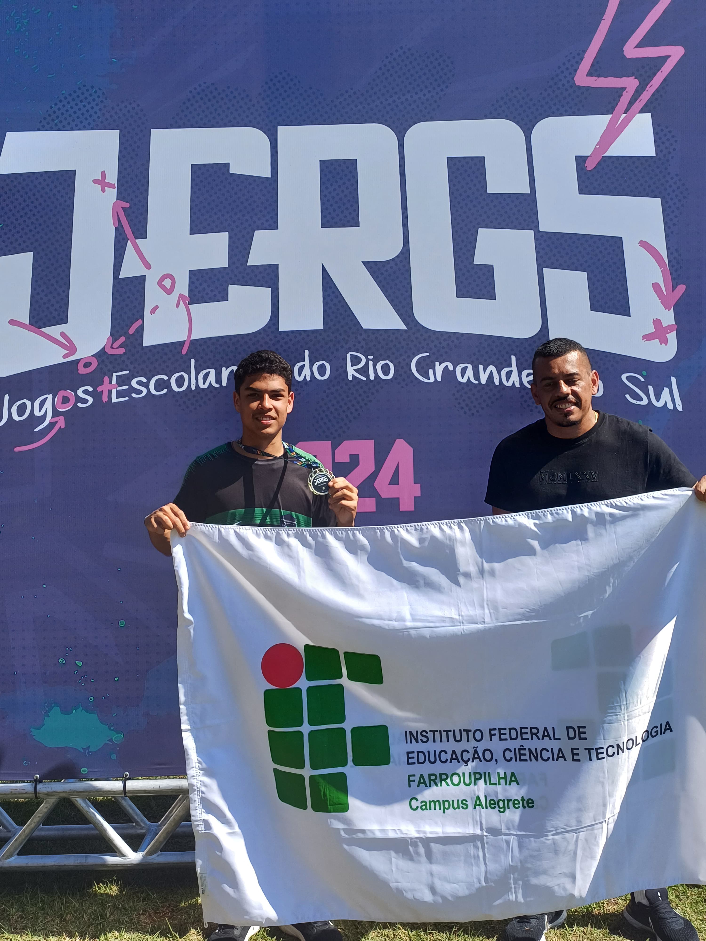 Após a participação nos Jogos Estudantis do IFFar, o estudante Elielson Guedes, do 3º ano do Curso Técnico em Agropecuária, representou o IFFar - Campus Alegrete nos Jogos Escolares do RS, em Porto Alegrete, sagrando-se campeão estadual na modalidade salto triplo, com a marca de 12,15 metros. O aluno foi acompanhado pelo Professor de Educação Física, Jéferson Queiroz.