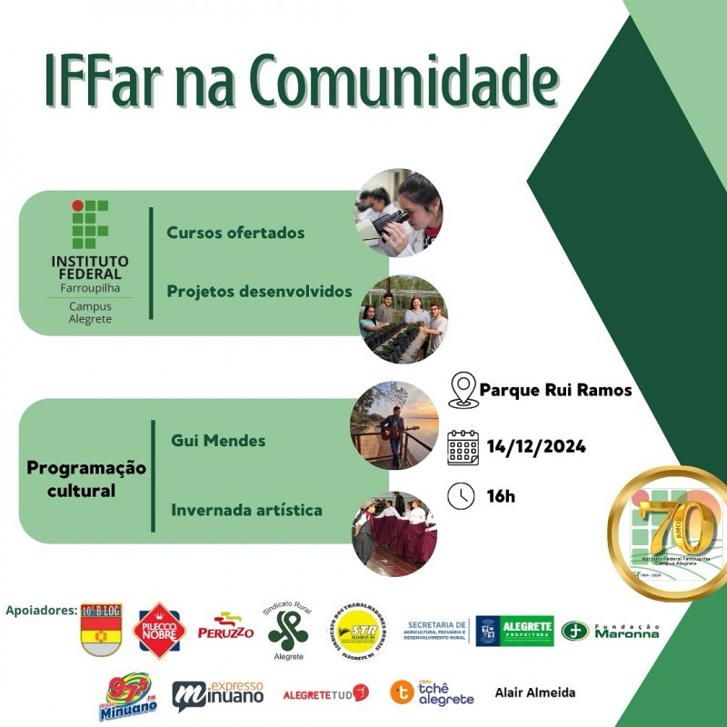 No próximo sábado, dia 14, a partir das 16h, o Parque Rui Ramos será palco de uma grande celebração em homenagem aos 70 anos do Campus Alegrete do Instituto Federal Farroupilha (IFFar). O evento "IFFar na Comunidade" promete encantar os participantes com uma programação cultural diversificada e informativa.