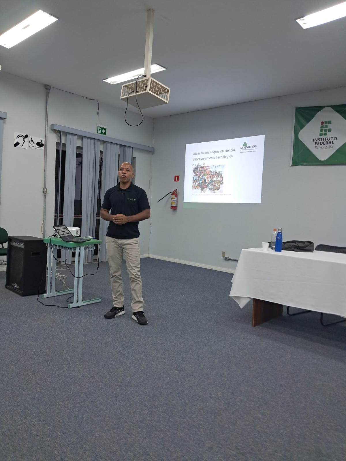 O evento contou com a participação do professor César Cristaldo, da UNIPAMPA Alegrete, que abordou um tema essencial e muitas vezes negligenciado: a atuação dos negros na ciência, no desenvolvimento tecnológico e na cultura. Durante a palestra, foram destacadas as contribuições significativas de cientistas, inventores e artistas negros que impactaram a sociedade ao longo da história.