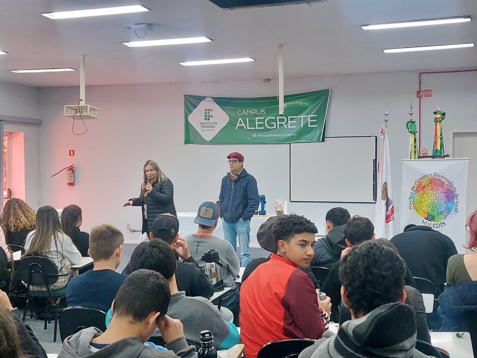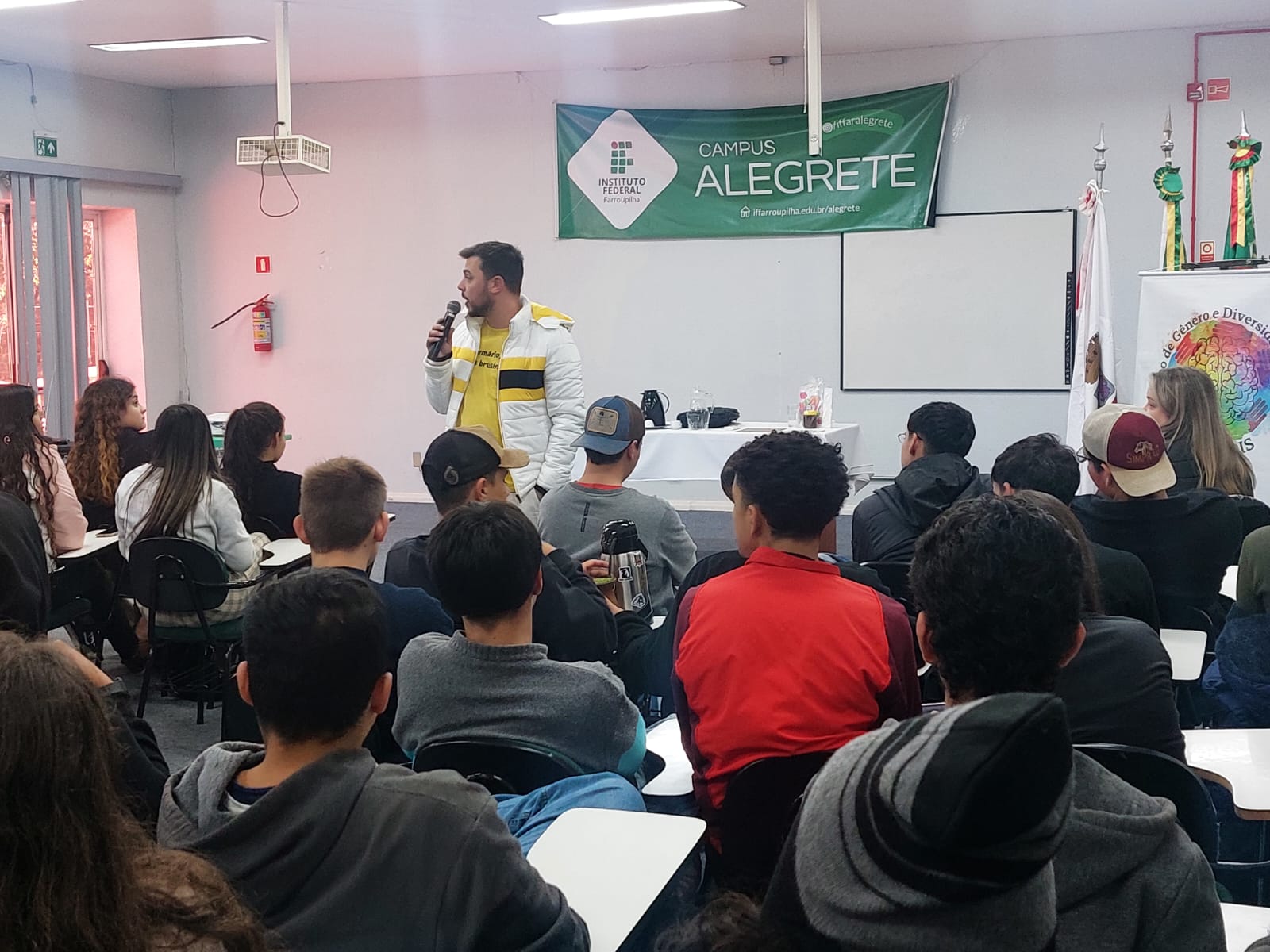 Na tarde desta terça-feira, dia 10/06, o auditório do Instituto Federal Farroupilha – Campus Alegrete recebeu a atividade alusiva ao Mês do Orgulho LGBTQIAPN+, promovida pelo Núcleo de Gênero e Diversidade Sexual (NUGEDIS) e Coordenação de Ações Afirmativas. O evento contou com a presença do advogado e professor Dr. João Monteiro, que ministrou uma palestra sobre diversidade, inclusão e os direitos legais da população LGBTQIAPN+.