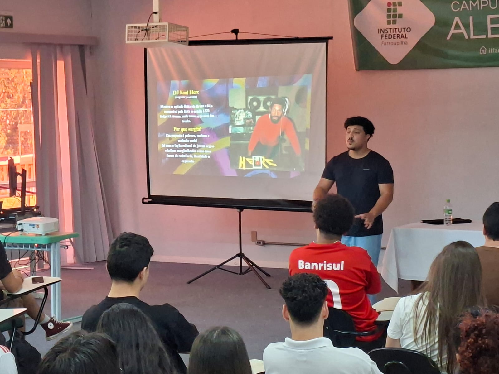 A ação contou com a palestra “Entre rimas e reflexões: o povo negro na arte do Rap”, ministrada por Henry Kesman, aluno do curso Técnico em Informática e integrante do NEABI.