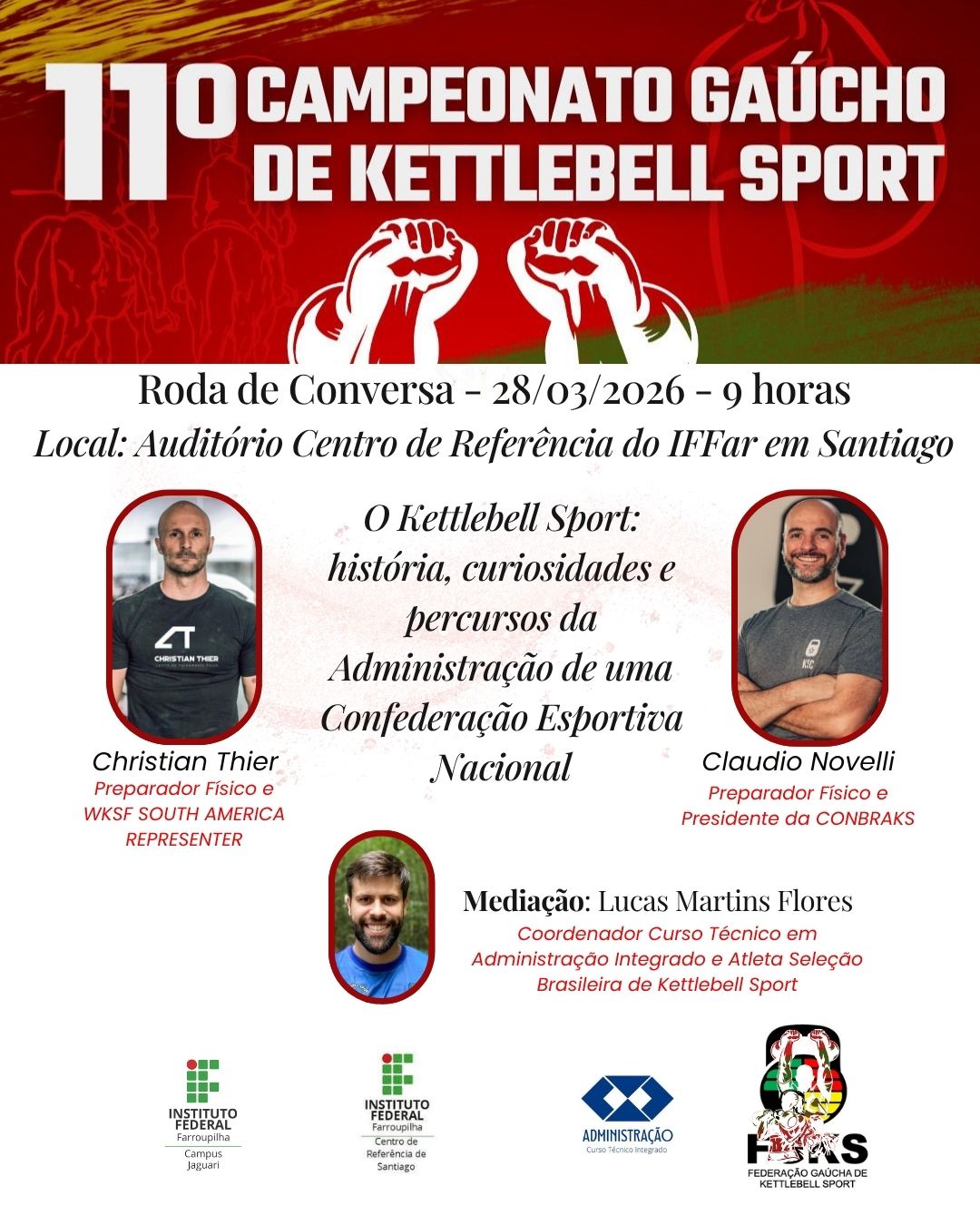 O 11º Campeonato Gaúcho de Kettlebell Sport acontece nos dias 28 e 29 de março no Centro de Referência do IFFar em Santiago. O evento promove a integração entre atletas, estudantes, famílias e comunidade em geral, além de divulgar e incentivar o crescimento da modalidade no Rio Grande do Sul.