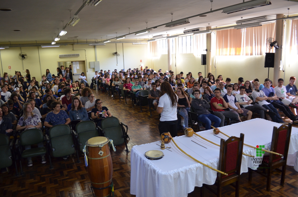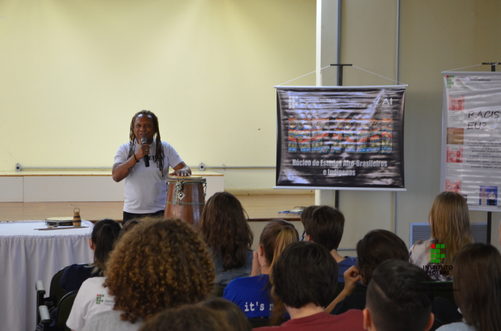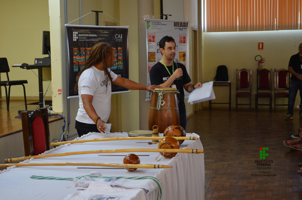 O convidado conduziu uma conversa com as/os estudantes acerca das vivências enquanto capoeirista de carreira internacional; as origens da Capoeira no Brasil e seus significados como uma prática que se expandiu e que se caracteriza pela diversidade étnico-racial de seus praticantes. Além disso, a fala foi permeada pela sonoridade dos instrumentos que participam da Capoeira e da participação do público presente (estudantes dos cursos técnicos em Agropecuária e Informática integrados ao Ensino Médio e servidores/as).