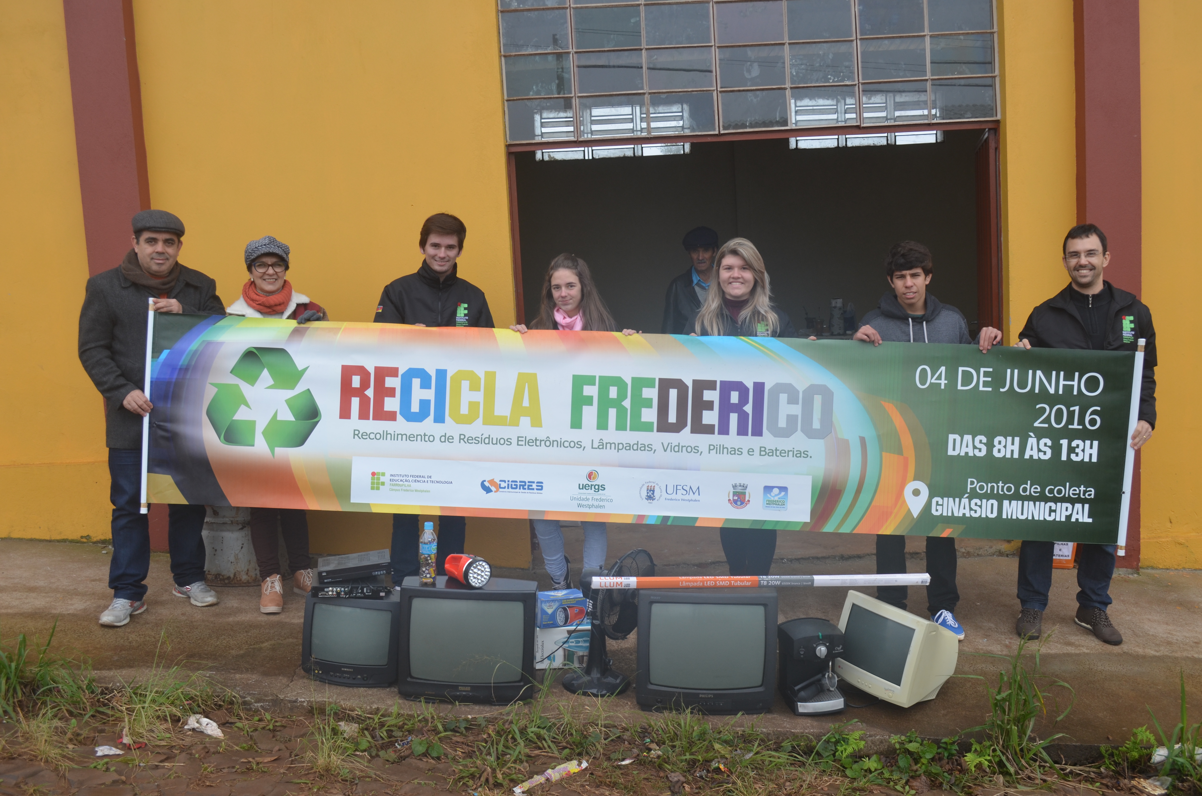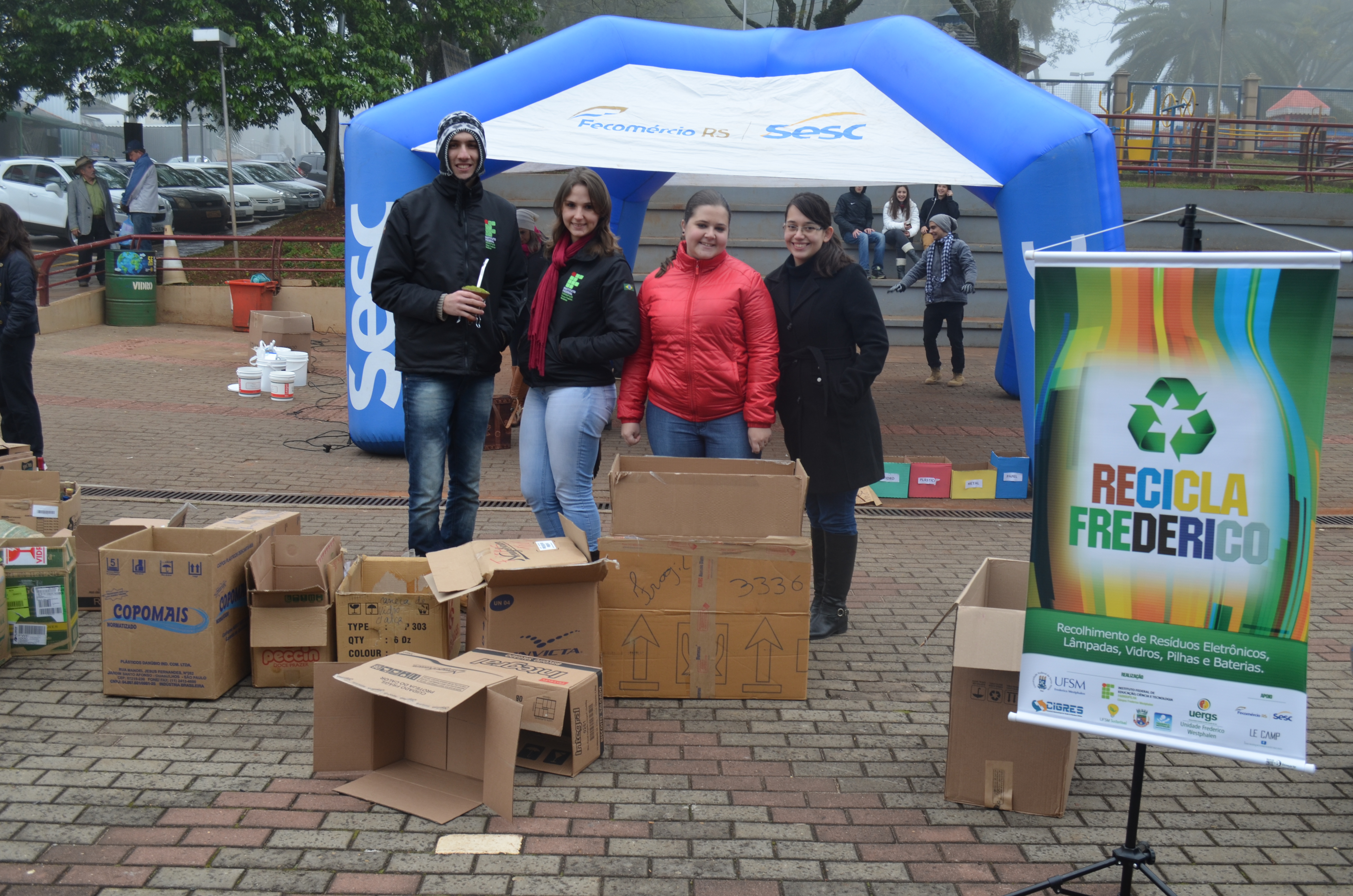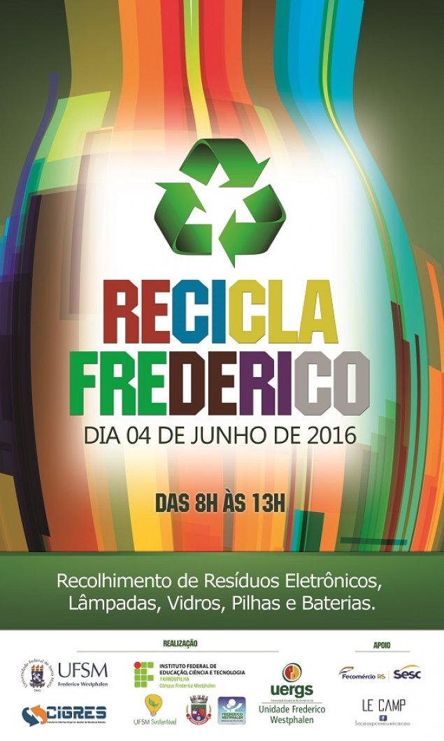 Em contato com a Universidade Federal de Santa Maria (UFSM), Campus Frederico, por meio do curso de Engenharia Ambiental, com a coordenação da prof. Dra. Aline Ferrão Custódio Passini; com a Universidade Estadual do Rio Grande do Sul (UERGS), coordenada pela profa. Ma. Analisa Tiburski e o prof. Me. Lucas Ávila; e com o apoio da Direção Geral e Administrativa do Campus Frederico e cooperação das profs. Dra. Cândida Toni, Me. Pâmela Flack, Me. Maria Inês Manfio e o prof. Me. Bruno Boniati, formamos uma baita equipe, fazendo surgir assim o Projeto Recicla Frederico. Contamos também com o apoio do SESC, Le Camp Comunicações – que criou a marca – e a Prefeitura Municipal através da Secretaria do Meio Ambiente.