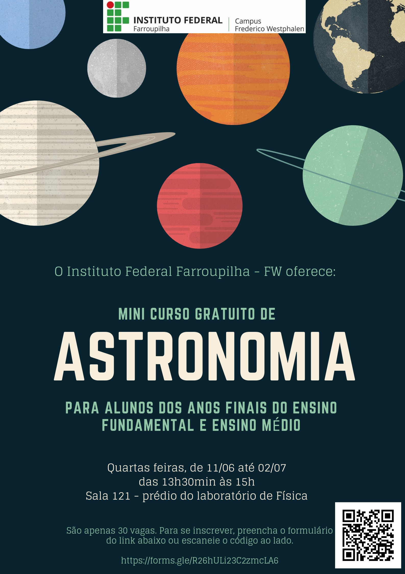 O Instituto Federal Farroupilha, por meio do projeto de extensão “Astronomia para iniciantes: um breve olhar sobre o universo”, oferecerá um curso gratuito para alunos das séries finais do ensino fundamental (7°, 8° e 9° ano) da rede pública. O curso contará com 5 encontros presenciais, com aulas práticas e teóricas ministradas por estudantes da Instituição.