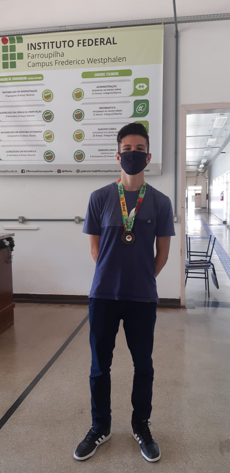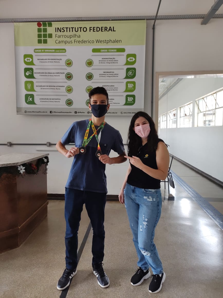 A sua participação foi premiada e, no dia 15 de dezembro de 2021, Gabriel recebeu a medalha de 3º lugar referente à fase regional no prédio central do campus Frederico Westphalen, acompanhado pela professora de Educação Física, Myllena Camargo de Oliveira.