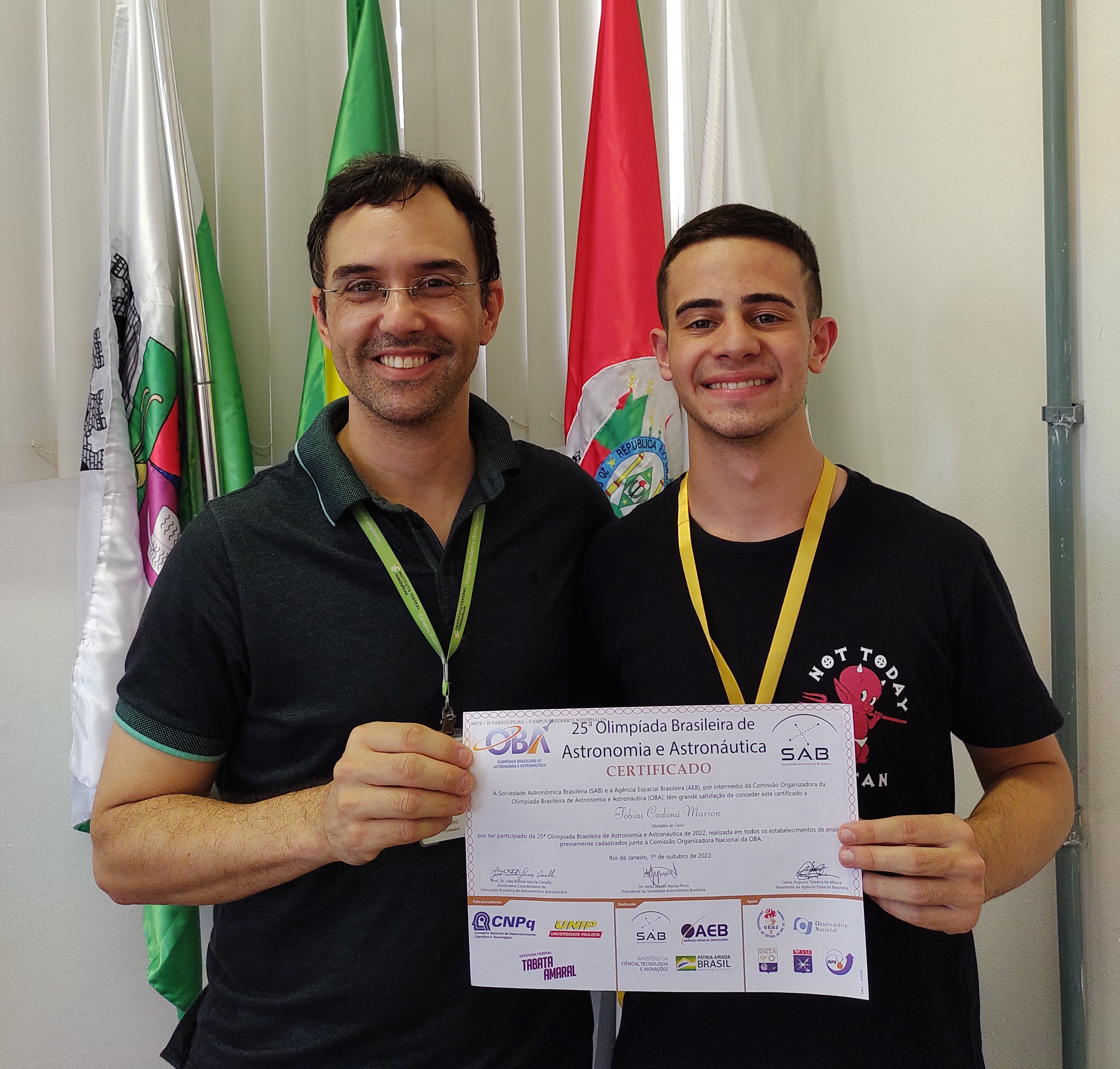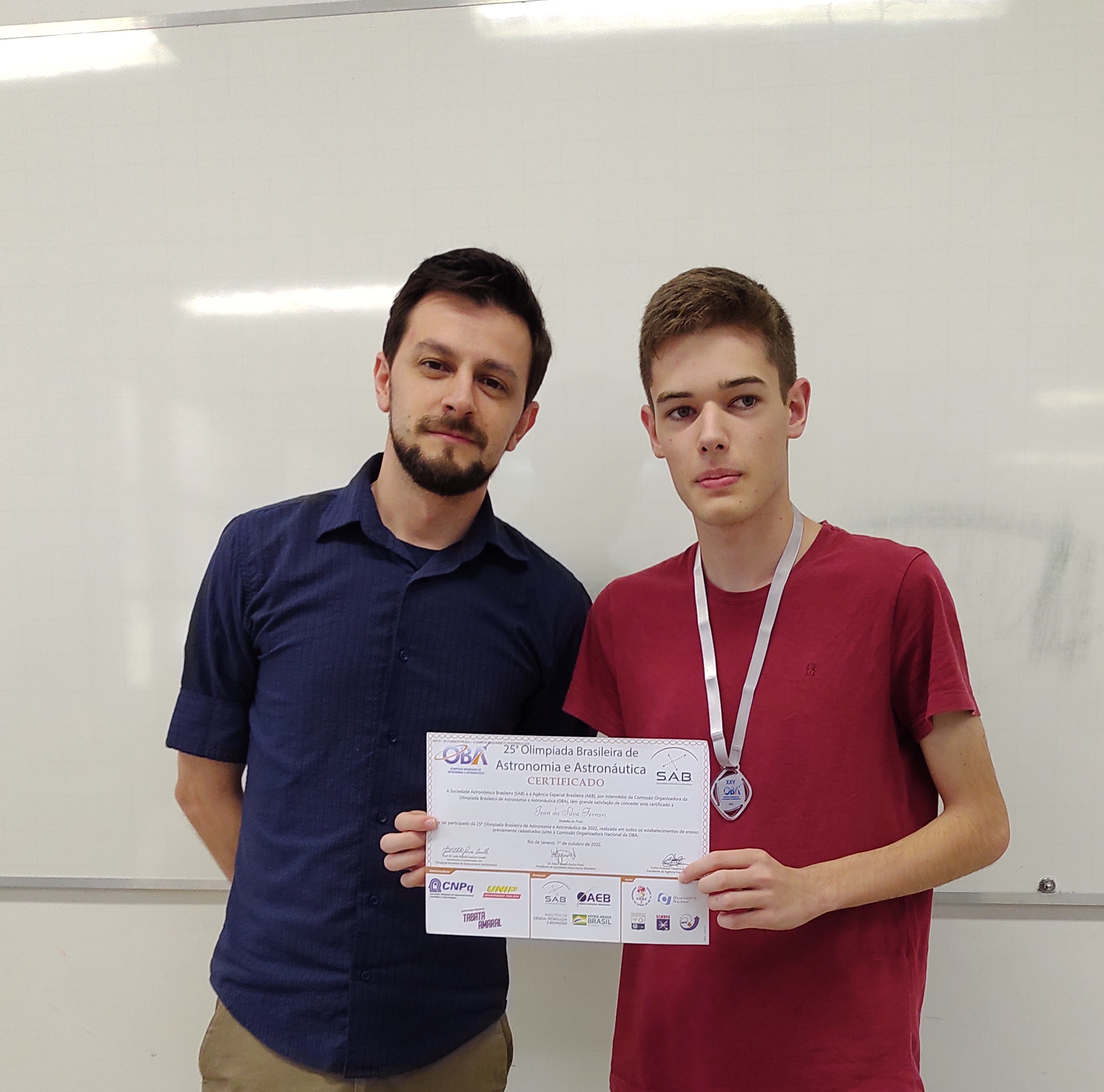 Neste ano, os alunos Tobias Cadoná Marion e Jean da Silva Ferrari do curso técnico integrado em informática, conquistaram medalhas de ouro e prata respectivamente. Além da premiação, os dois medalhistas foram convidados para participar das seletivas para as provas internacionais de Astronomia e Astrofísica. O processo finaliza por selecionar as duas equipes de 5 alunos que representarão o Brasil em duas olimpíadas internacionais.