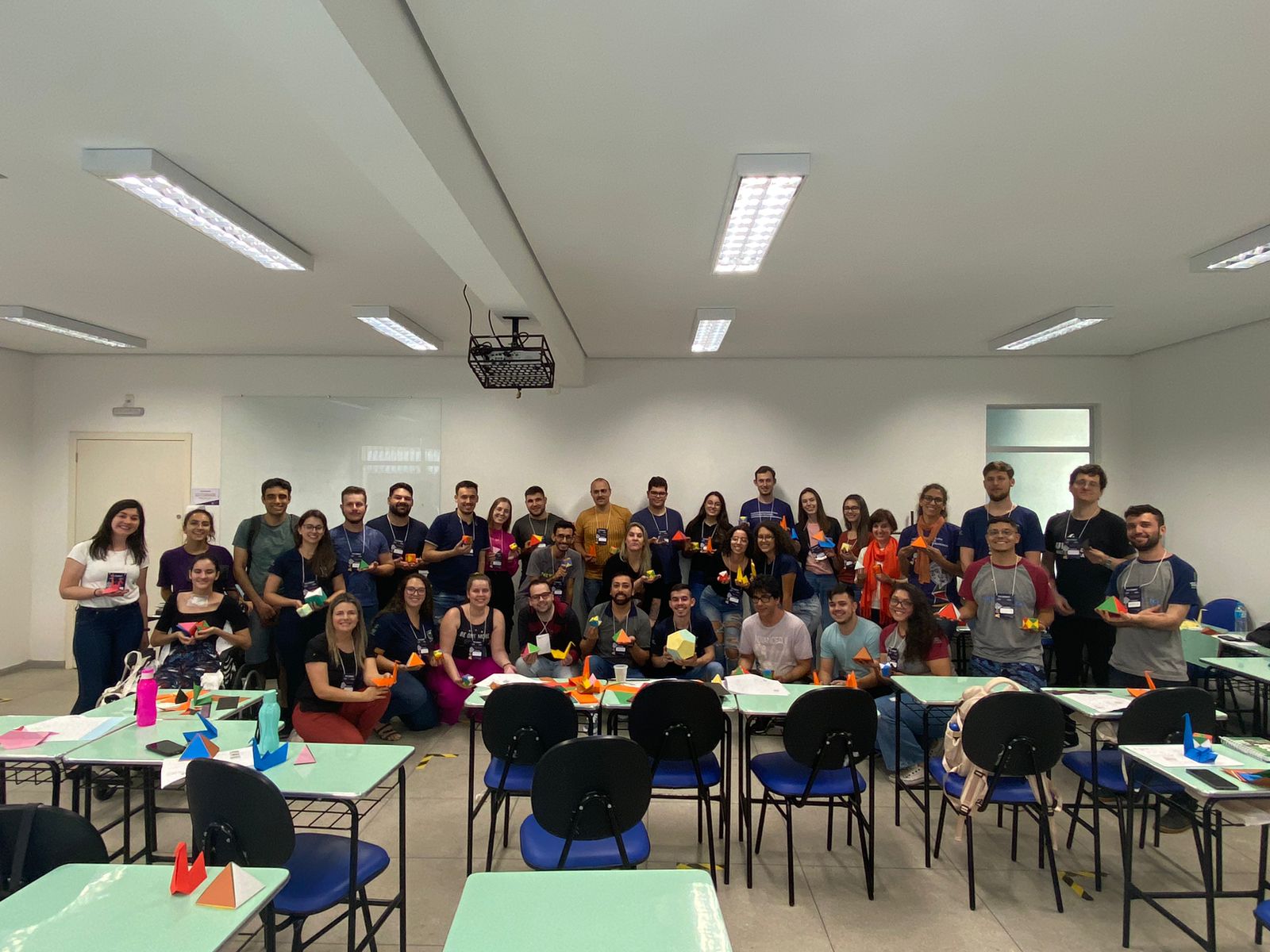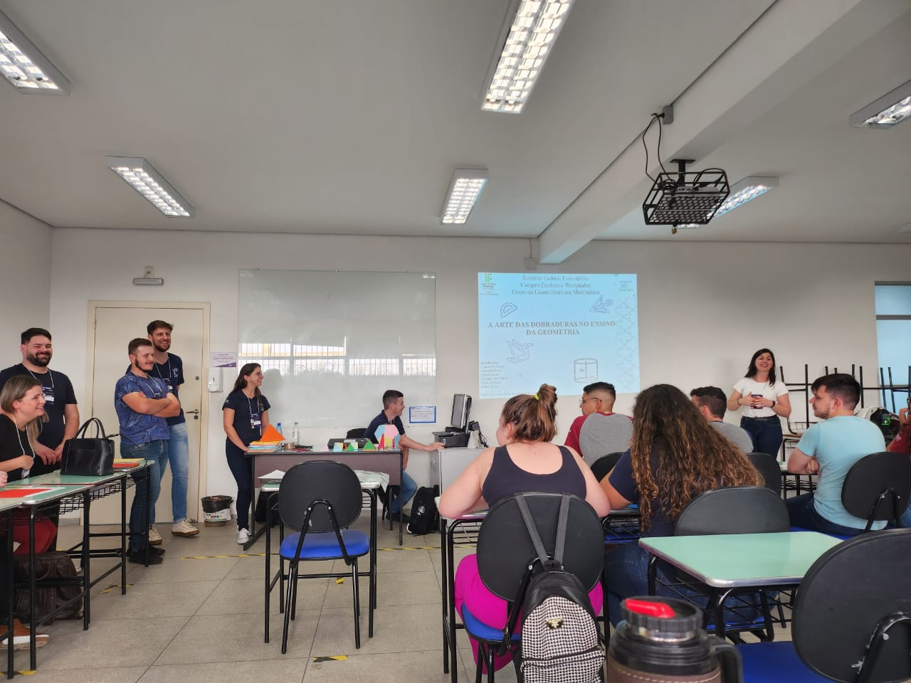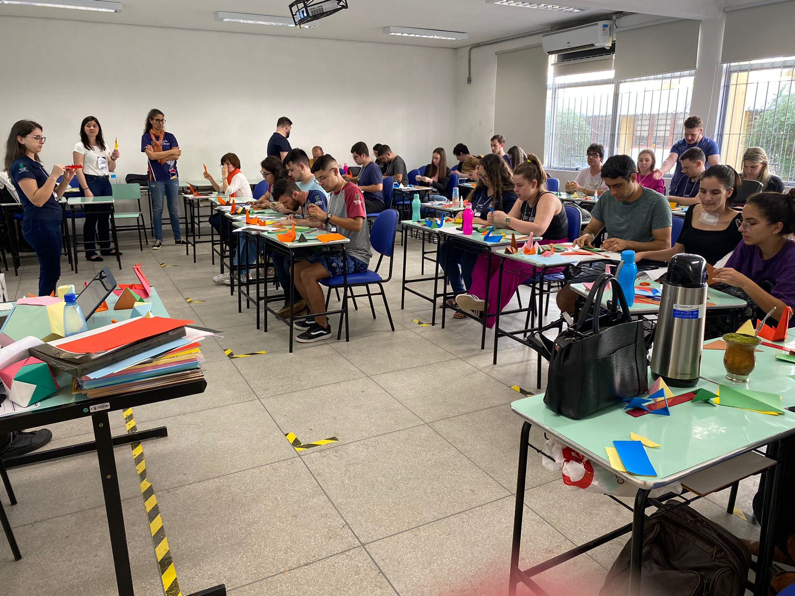 Ainda neste evento os estudantes participantes do programa institucional da Residência Pedagógica, coordenado pela Prof.ª Dr.ª Ana Queli Mafalda Reis Lautério, e ministraram o minicurso intitulado “A arte das dobraduras no ensino da geometria”.
