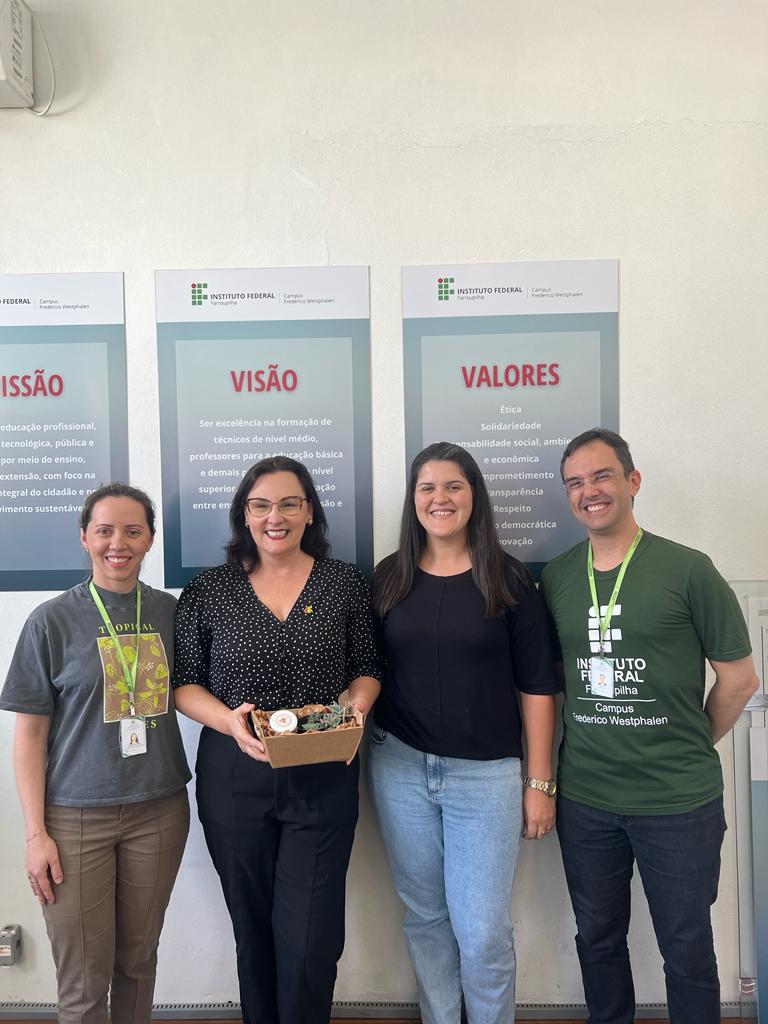 Em um gesto de apreço, as Servidoras responsáveis pelo Laboratório de Ensino, Pesquisa e Extensão em Agroindústria, Tatiane Asturian, e do Laboratório de Ensino, Pesquisa e Extensão em Floricultura e Paisagismo, Ângela Ramos dedicaram uma lembrança à Prof. Nídia Heringer, Reitora da instituição.
