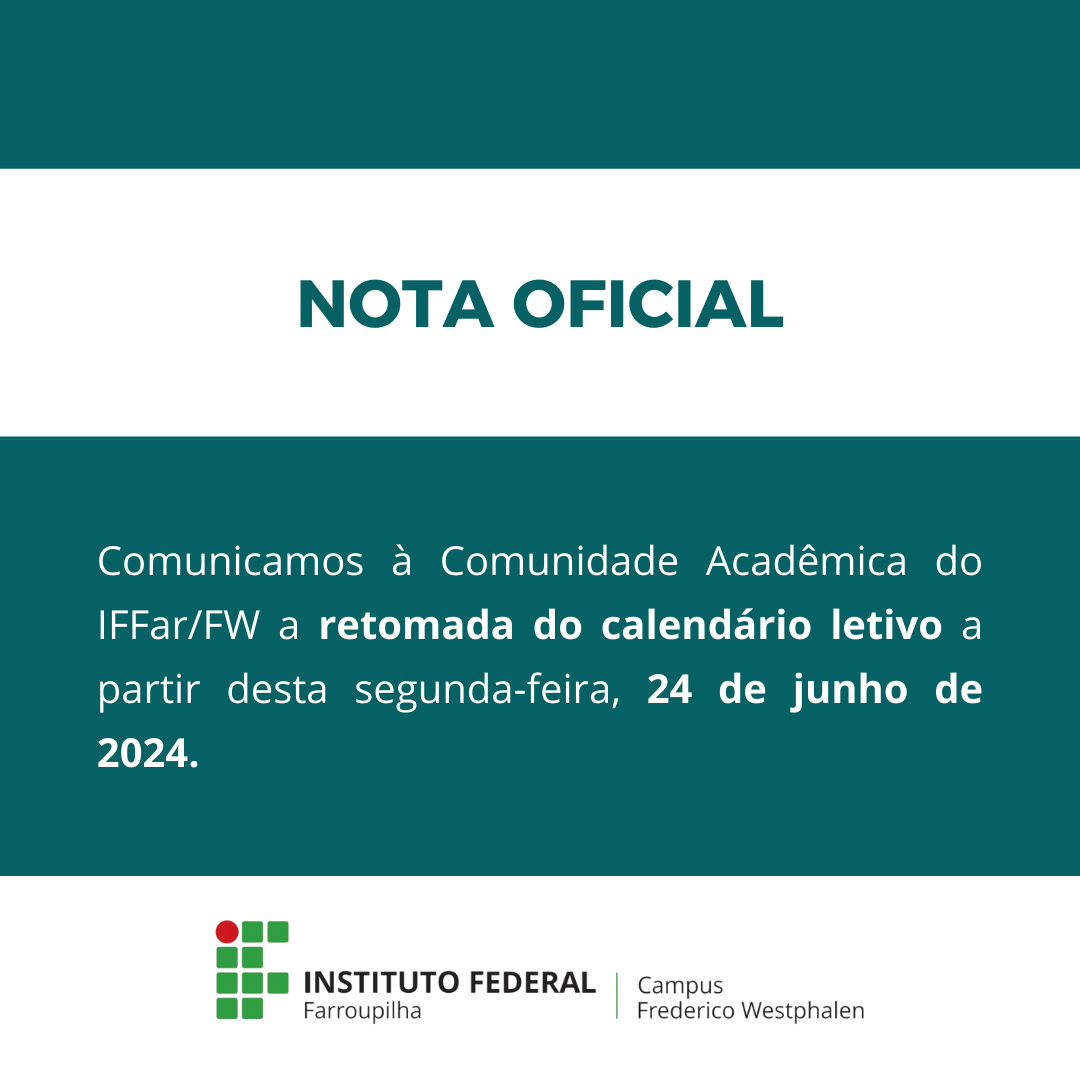 Dessa forma, comunicamos a todos os estudantes a retomada do calendário letivo a partir desta segunda-feira, 24 de junho de 2024. Na próxima semana retomaremos a contagem dos dias letivos, entretanto, esclarecemos que um novo calendário será organizado, e discutido, em breve.