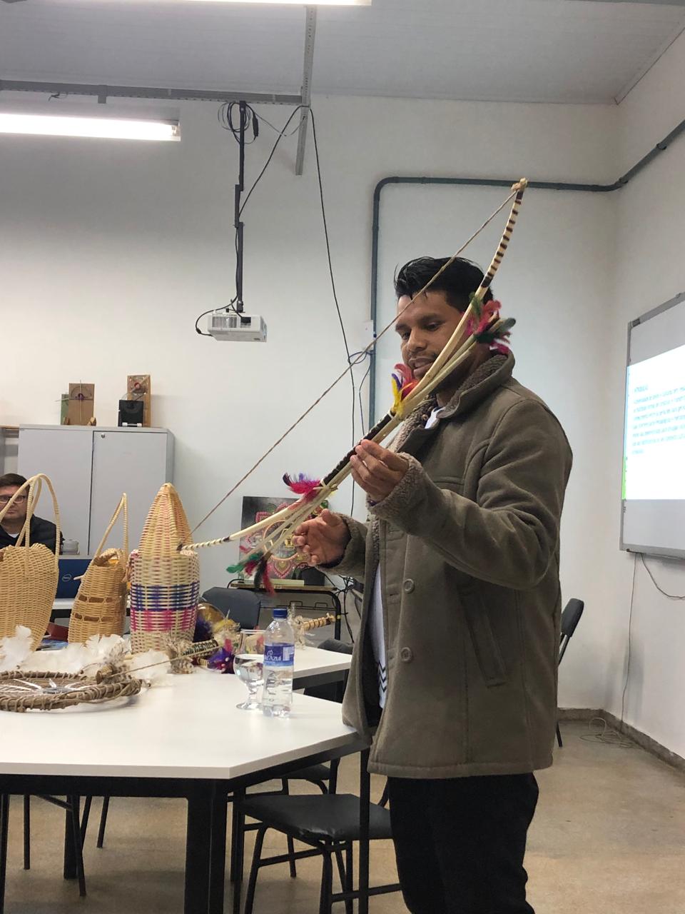 Em sua fala, o Professor Moisés abordou vivências acerca etnomatemática enquanto metodologia capaz de aliar o ensino de conceitos matemáticos com elementos culturais, especialmente, relacionados ao artesanato Kaingang.