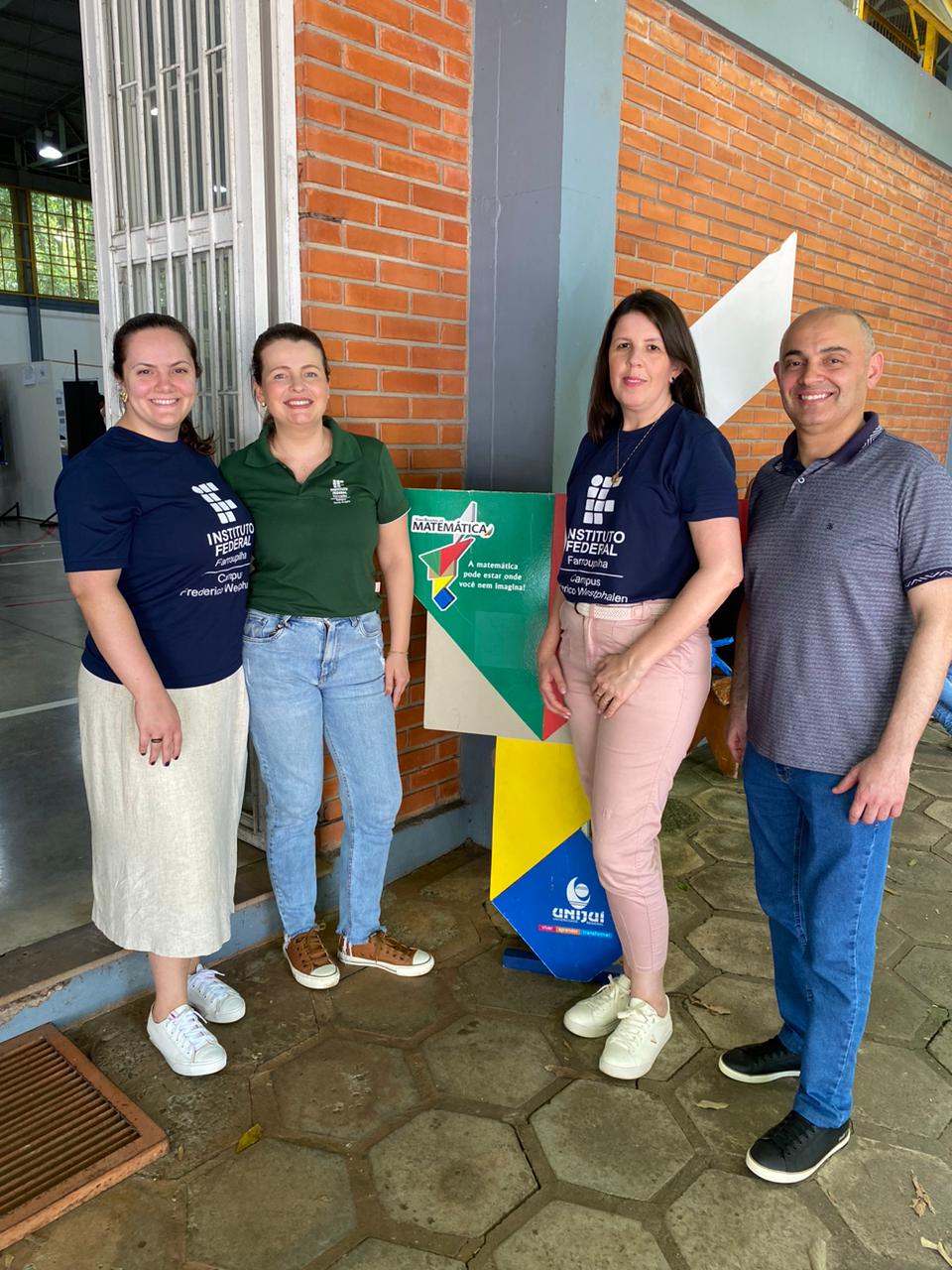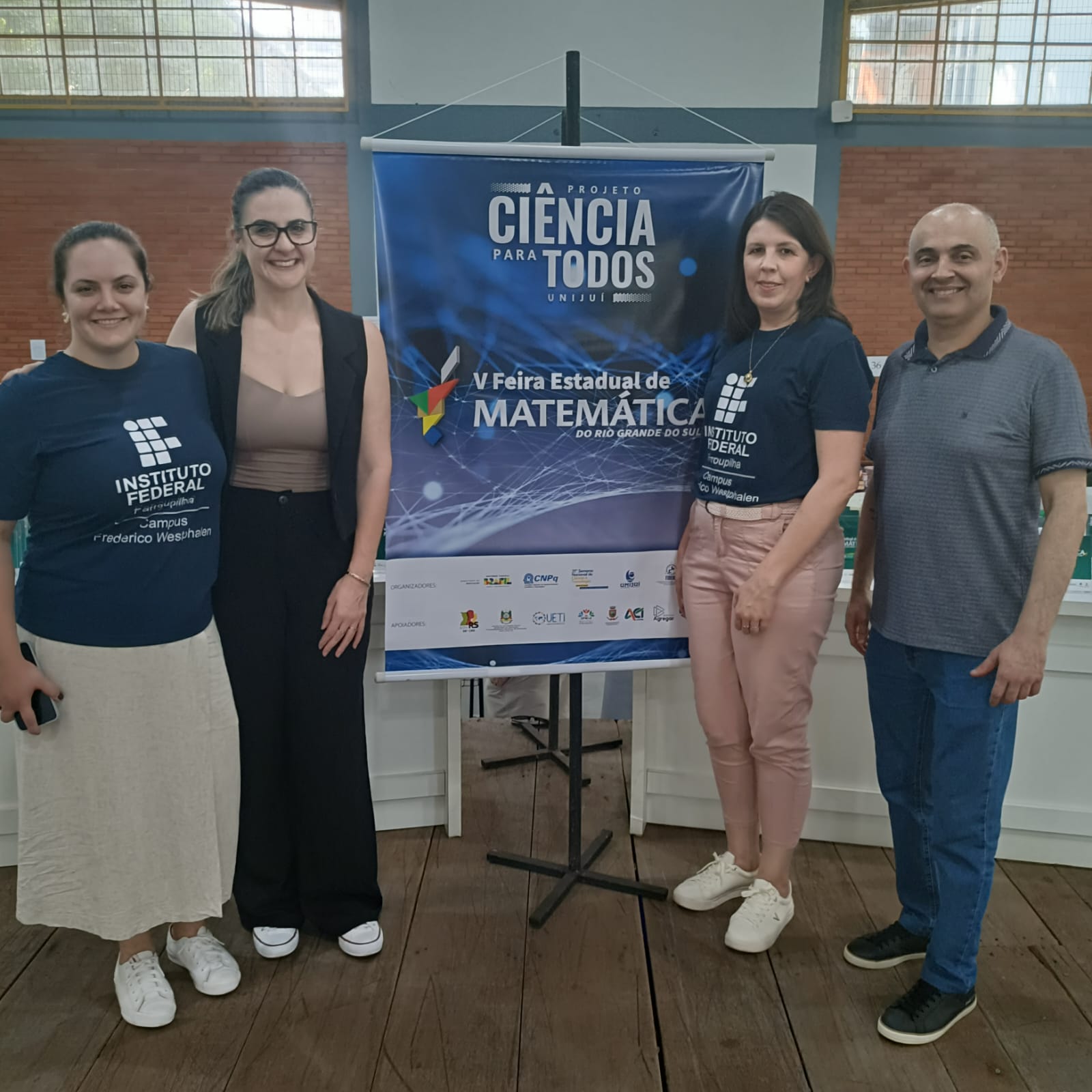 Na quarta-feira, dia 23 de outubro de 2024, aconteceu a V Feira Estadual de Matemática do Rio Grande do Sul, no ginásio didático da sede acadêmica da Universidade Regional do Noroeste do Estado do Rio Grande do Sul (Unijuí) localizada em Ijuí – RS. A professora Ana Queli Mafalda Reis Lautério do campus Santo Ângelo e os professores Bruna Larissa Cecco, Cleber Mateus Duarte Porciuncula e Renata Zachi do curso de Licenciatura em Matemática do campus Frederico Westphalen participaram como avaliadores do evento, visando conhecer os processos inerentes a esse importante movimento para o fortalecimento da Matemática na região de abrangência do campus do IFFar – FW.