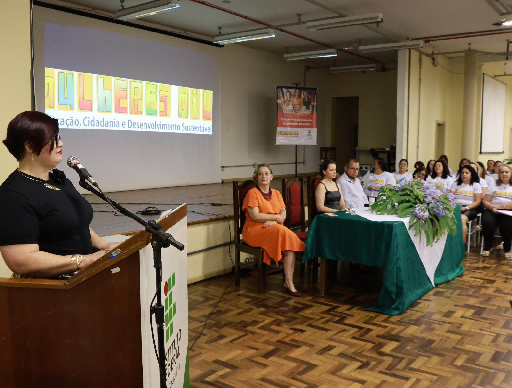 Com um público formado por familiares, servidores do campus e autoridades locais, a solenidade teve início com a entrada das formandas e a exibição de um vídeo que registrava as atividades realizadas ao longo da formação. Na sequência, a diretora-geral do campus, professora Silvana Alves Pedrozo, juntamente com a equipe do Programa Mulheres Mil, destacou o compromisso institucional com a promoção da inclusão social e da autonomia das mulheres atendidas pelo programa.