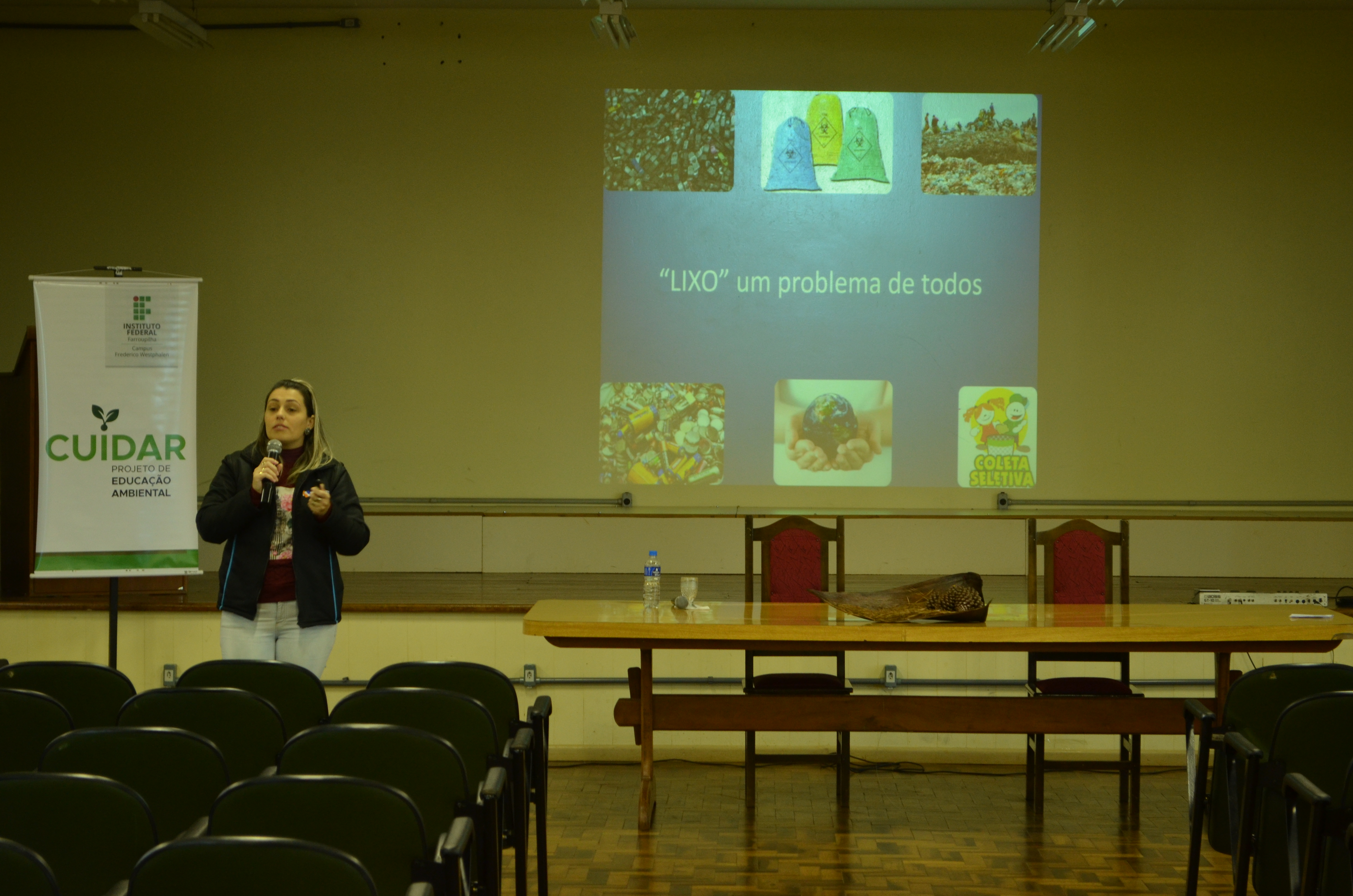 A bióloga que é responsável técnica do Consórcio Intermunicipal de Gestão de Resíduos Sólidos (Cigres) Thais Prestes Stein falou sobre a importância da separação de resíduos residênciais e suas implicações. Os alunos puderam participar com dúvidas e considerações sobre o tema, ao decorrer da manhã também houve apresentações musicais e mostra de artesanato feito com reaproveitamento de material reciclável.
