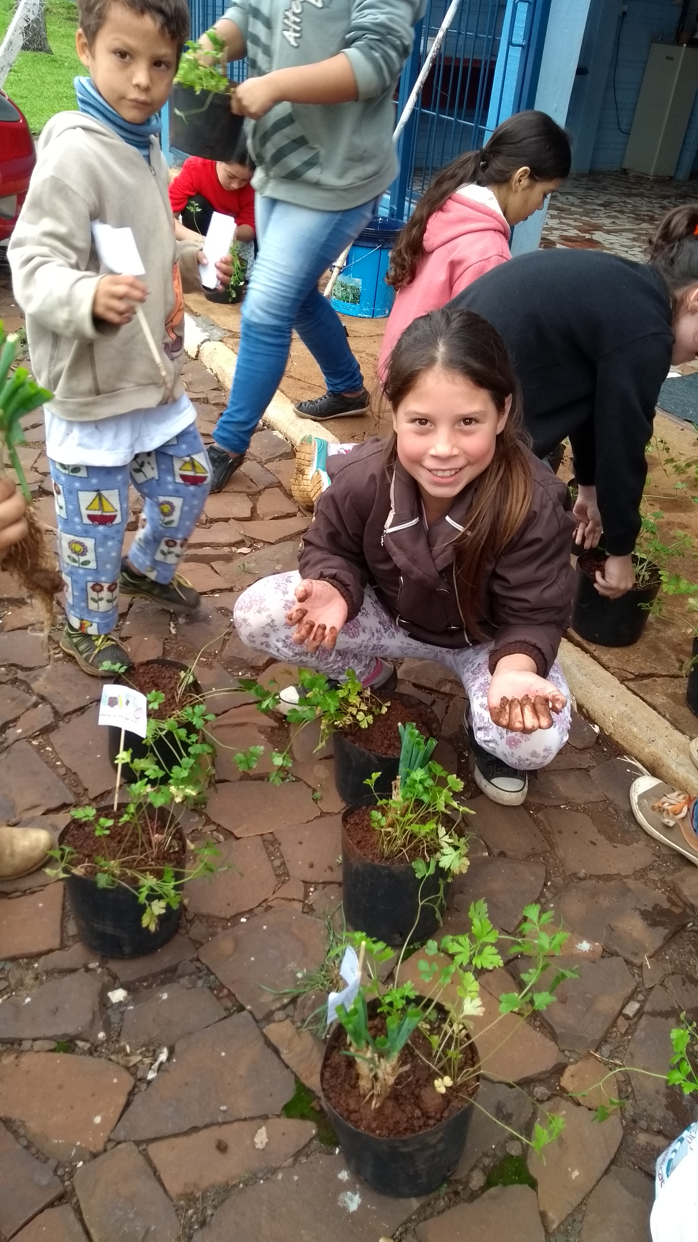 Ao final cada criança recebe orientações e tem a oportunidade de realizar o plantio de mudas de salsa e cebolinha. Cada criança é presenteada com um vaso com os temperos para levar para casa e cuidar com a família.