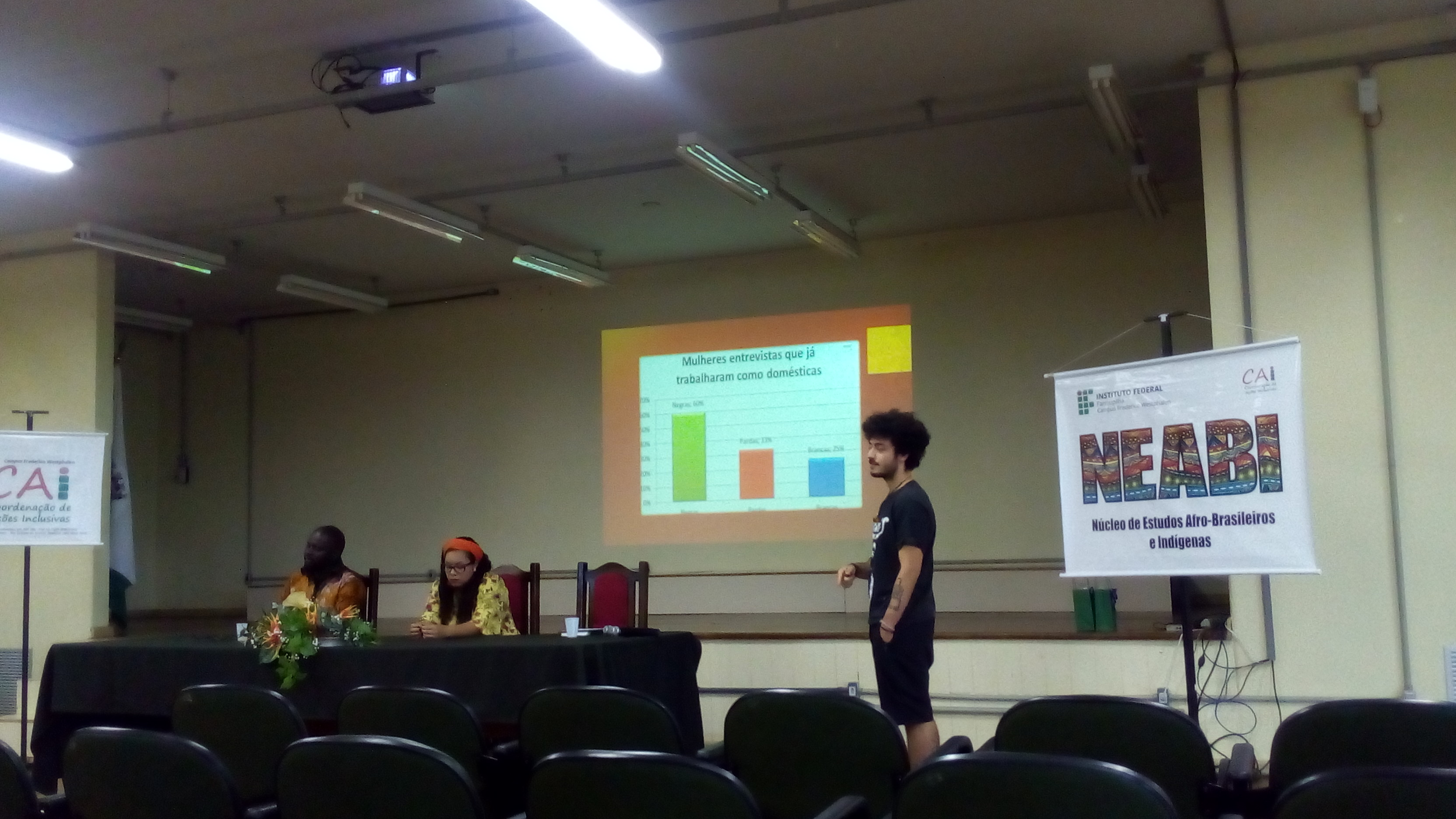 Na manhã do último sábado, 18, o NEABI vinculado a Coordenação de Ações Inclusivas (CAI) do Instituto Federal Farroupilha Campus Frederico Westphalen, organizou um painel com a exposição de duas temáticas centrais para o diálogo com o público presente: o preconceito racial associado ao trabalho e o preconceito e a discriminação em relação aos negros, em nível nacional, a partir do olhar de um imigrante africano que vive em Frederico Westphalen.