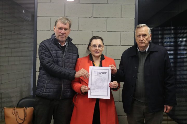 vice-prefeito de São Luiz Gonzaga, reitora do IFFar e prefeito de São Luiz Gonzaga (da esq. p/ dir.) seguram escritura assinada da área doada para o novo campus