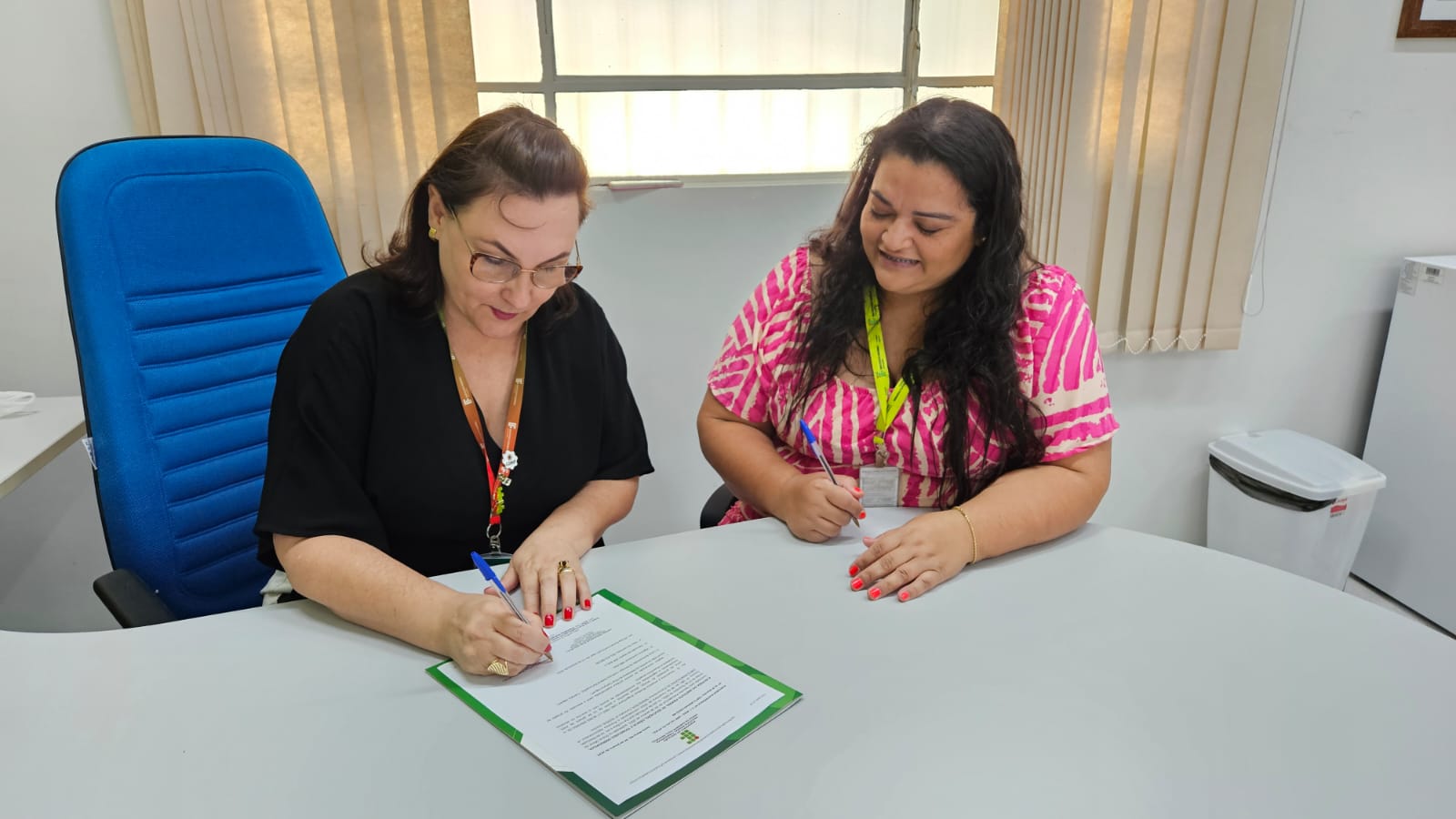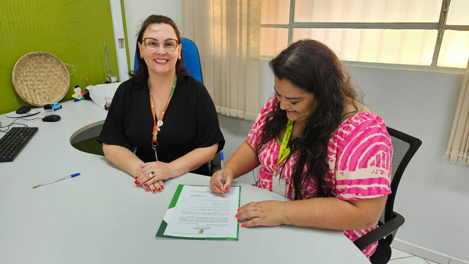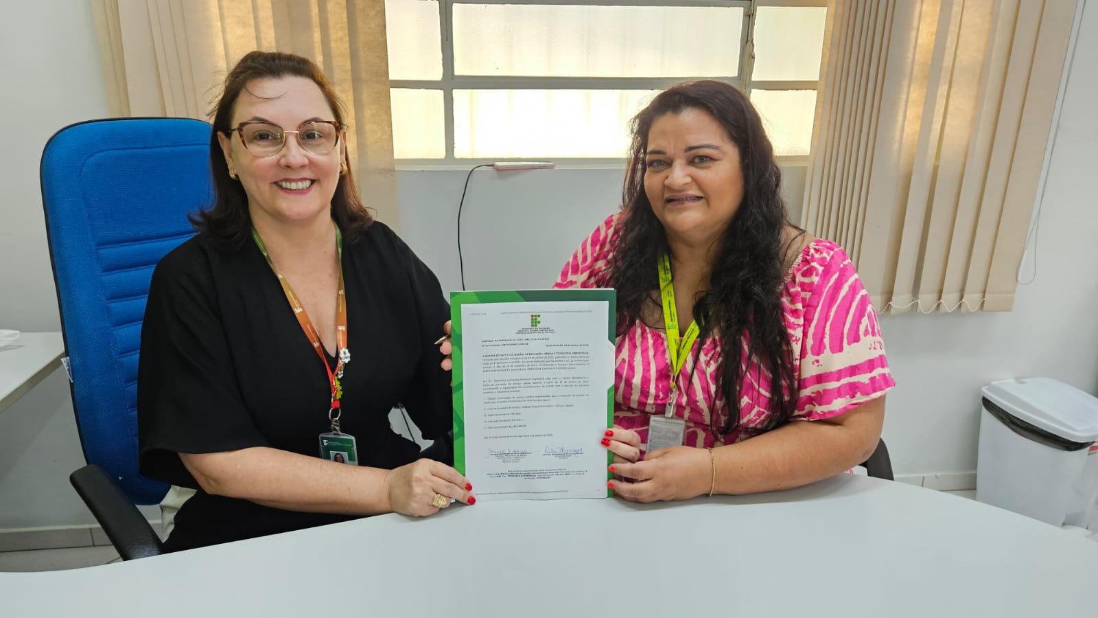 Foto: a assinatura da portaria contou com a presença da reitora, da diretora-geral substituta e de um representante da empresa responsável pela obra do refeitório estudantil.