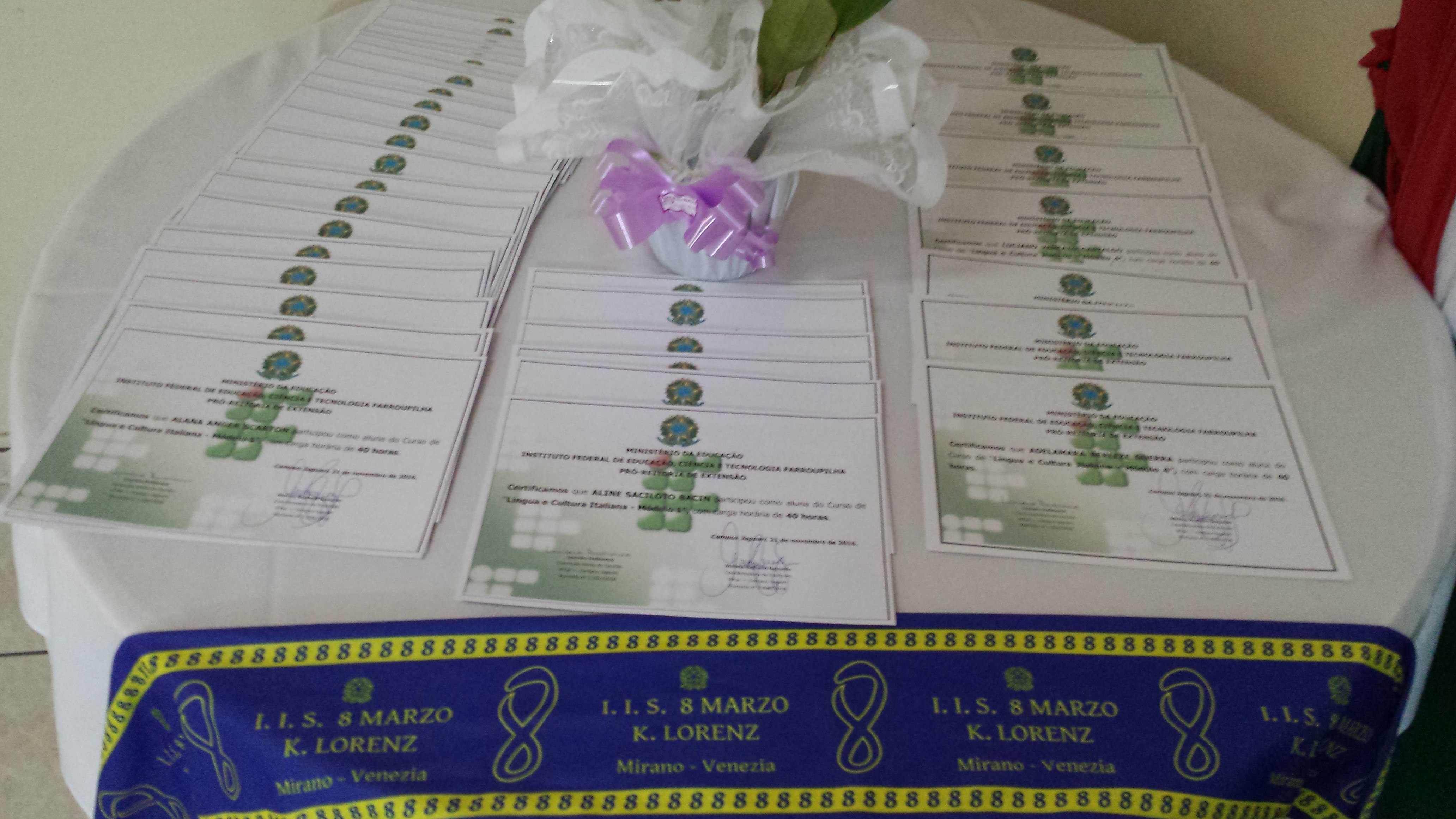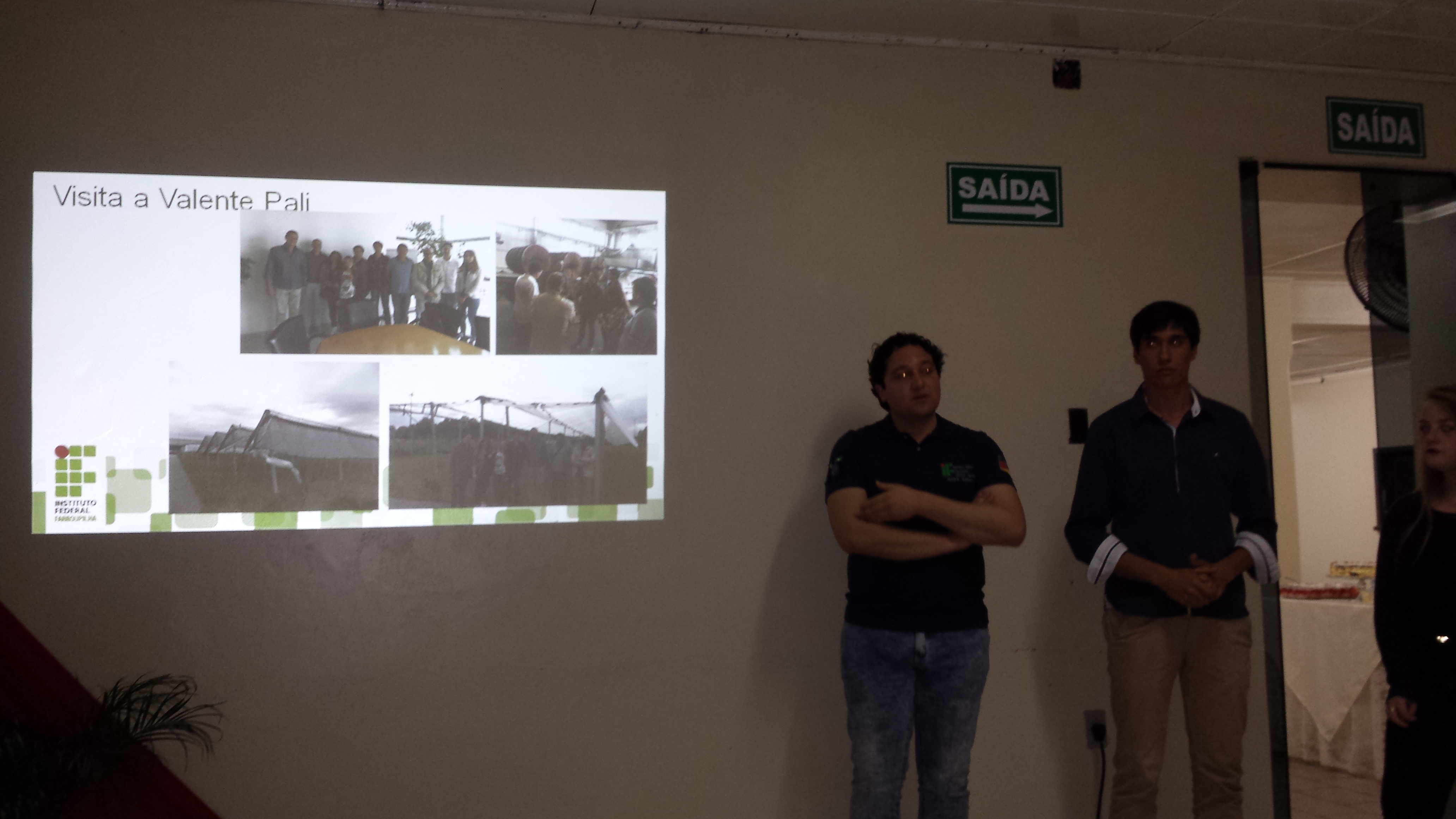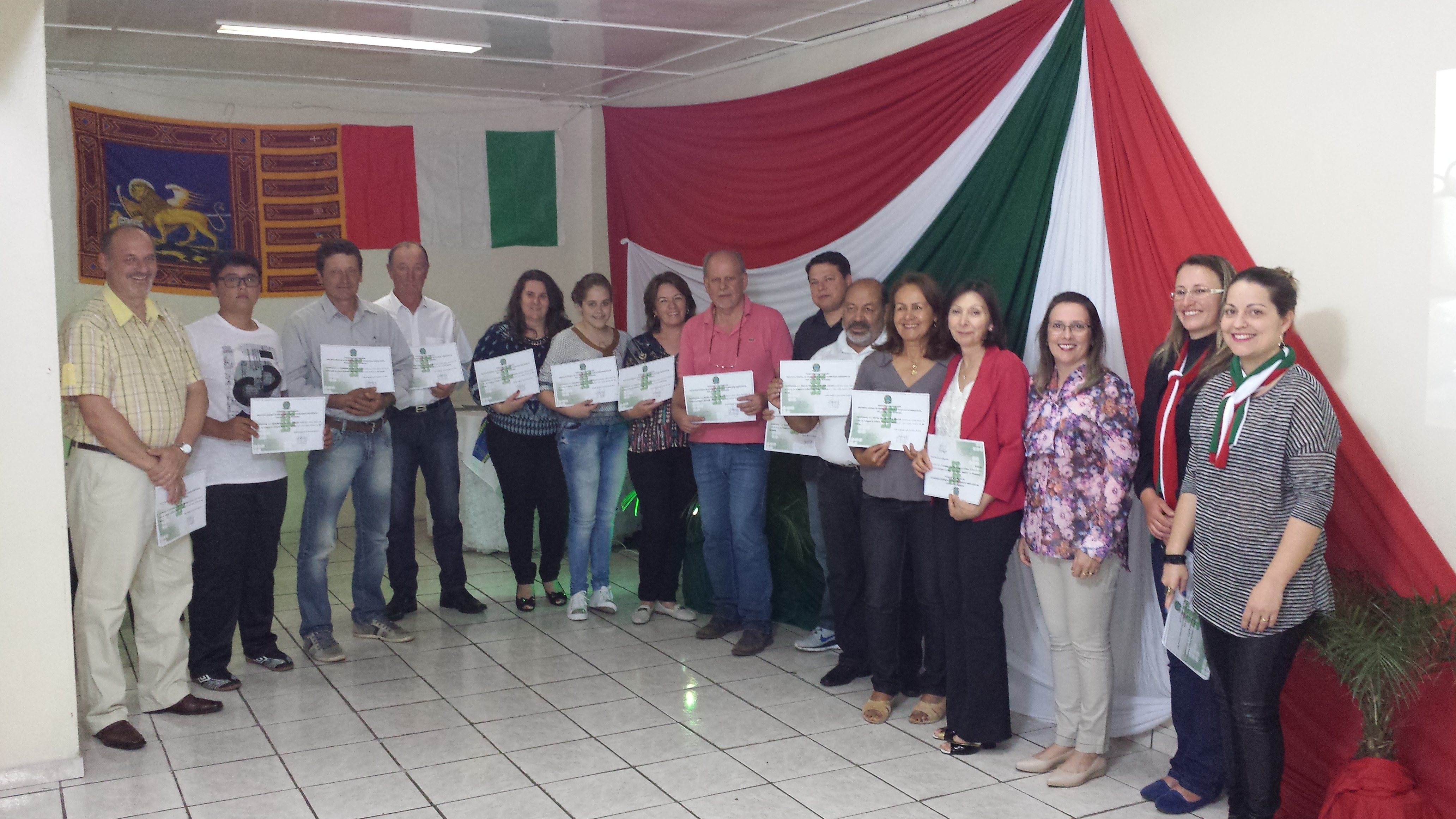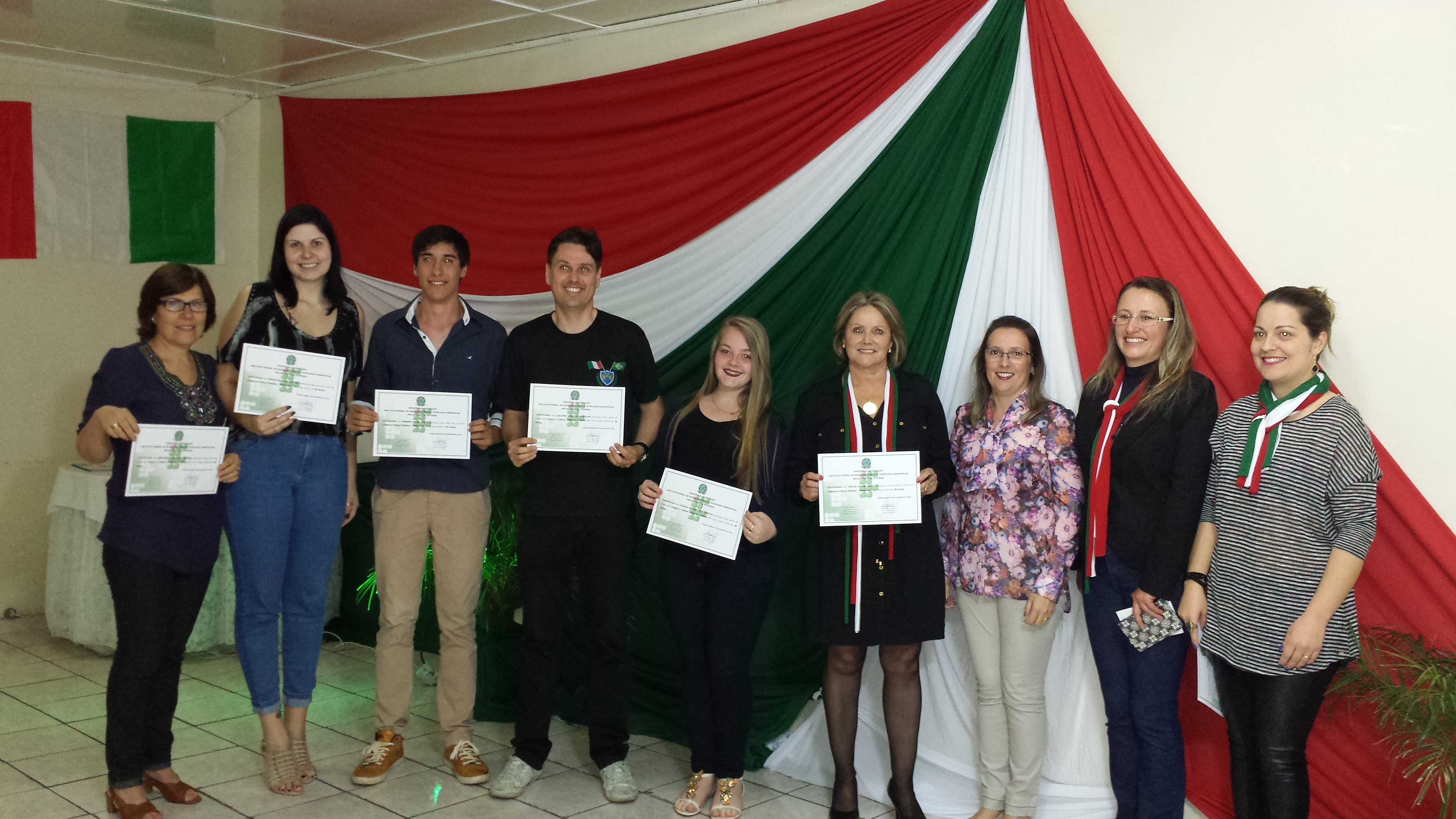 Na terça-feira, dia 22/11, ocorreu no Clube União de Jaguari, jantar festivo e entrega de certificados do Curso de Língua Italiana aos alunos dos módulo 1, 2 e 4, curso realizado numa parceria entre o Instituto Federal Farroupilha e a Associação Cultural Italiana do Vale do Jaguari. Na ocasião, o Servidor André Sabino e os alunos Vandré Sonza, Flavia Ferrari e Lucilene Ferrari apresentaram um resumo das atividades realizadas na Escola 8 Marzo-Klorenz de Mirano, Província de Veneza, Itália. Estavam presentes o Presidente do Sindicato dos Trabalhadores Rurais de Jaguari, José Minuzzi, o Enólogo da Cooperativa de Vinhos Jaguari, Valeri Guasso, Dagmar Reolon, representando o Presidente da mesma, e Melissa Reghelin Gastaldo, representando o IFFar - campus Jaguari. Os Alunos entregaram às entidades um material impresso de sua visita a Empresa Valente Pali, líder no setor de cobertura de vinhedos e fruticultura. Além disso, destacamos a presença de Sergio Dalla Valle, dos Vinhos Dalla Valle, Karine Minuzzi da Vinicola Minuzzi e das vereadoras Elisângela Picoli Dri e Katia Siqueira. A apresentação foi muito positiva pois permitiu aos presentes conhecer um pouco da realidade da agricultura familiar na Itália. O Servidor André Sabino destacou o desejo dos jovens da Associação de Produtores Rurais da Itália visitarem Jaguari no próximo ano, expandindo a possibilidade de intercâmbio para outros setores da nossa comunidade.