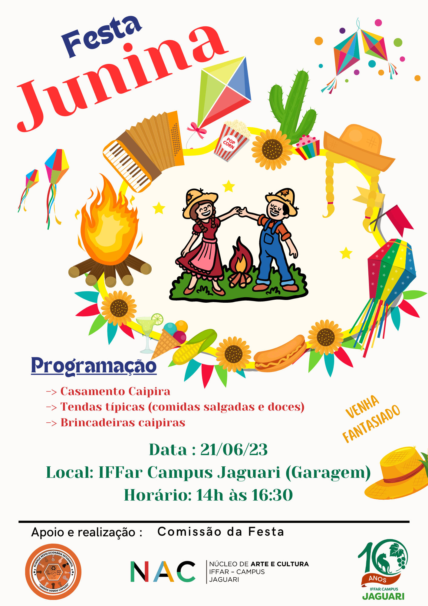 Em 21/06/2023 aconteceu a “Festa Junina” do IFFar Campus Jaguari. Teve brincadeiras tradicionais, tendas organizadas pelos estudantes e casamento caipira apresentado pelos estudantes do grupo de Teatro do Campus.