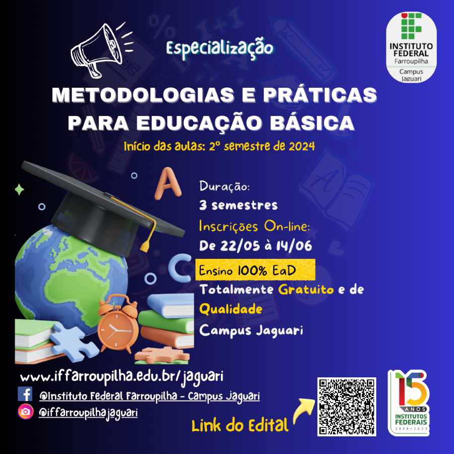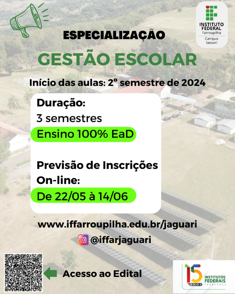 Abertas as inscrições para o Processo Seletivo dos Cursos de Especialização à distância do IFFar Campus Jaguari.
