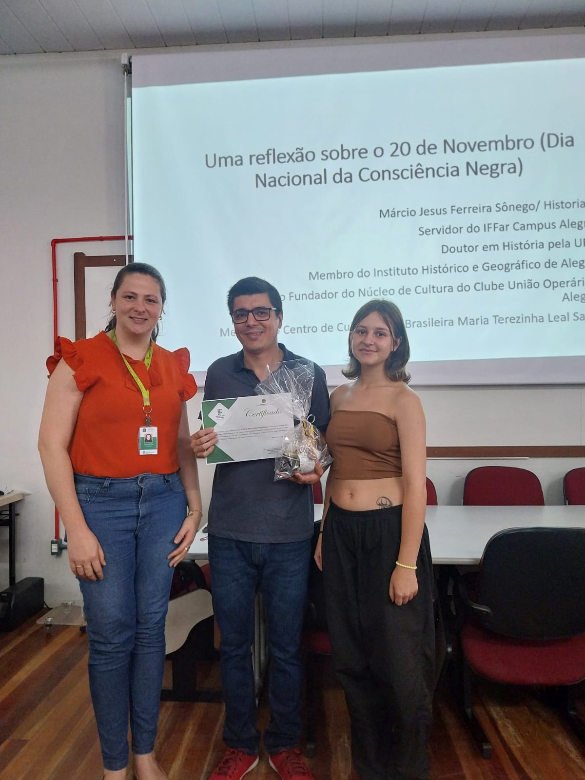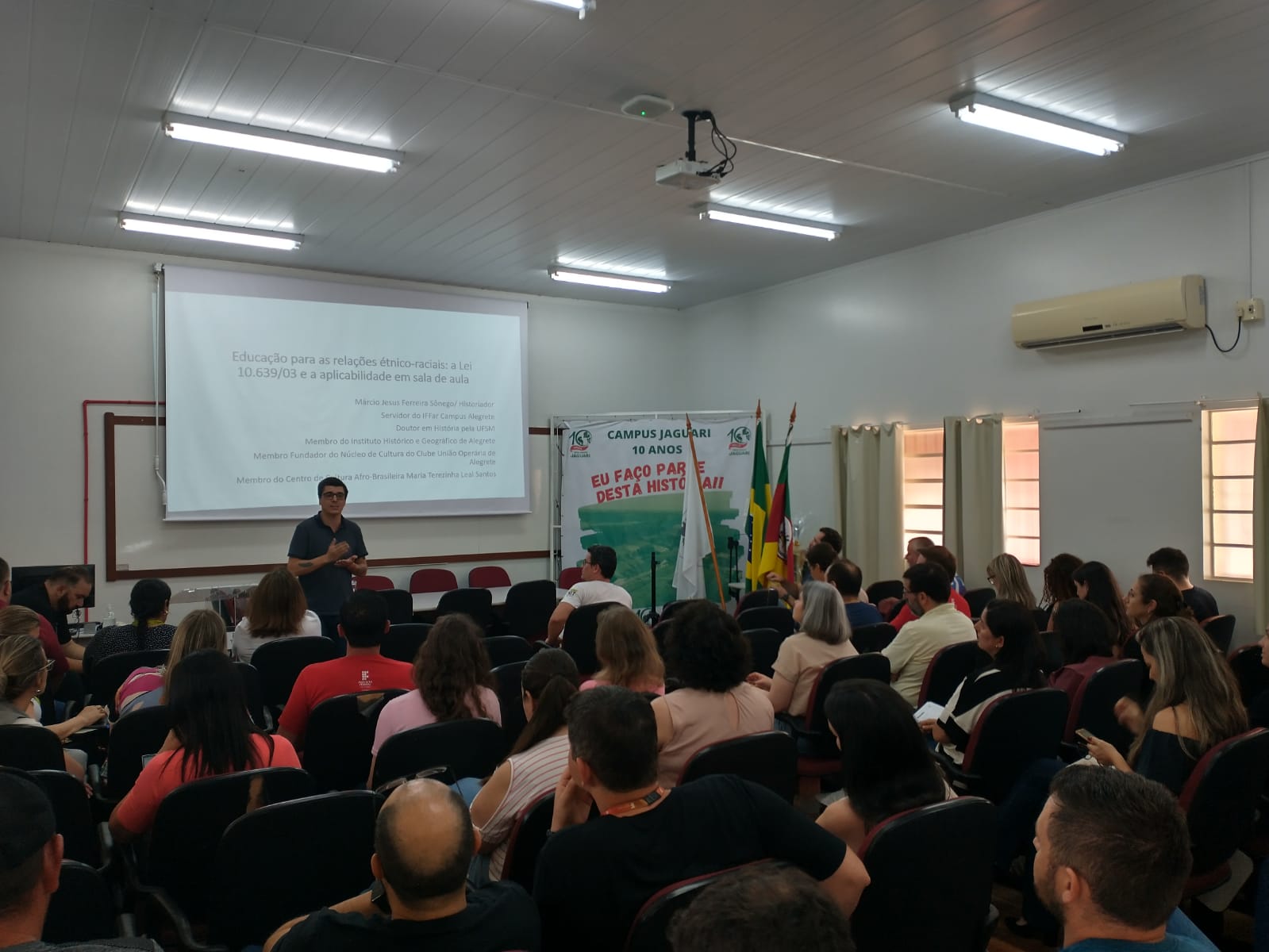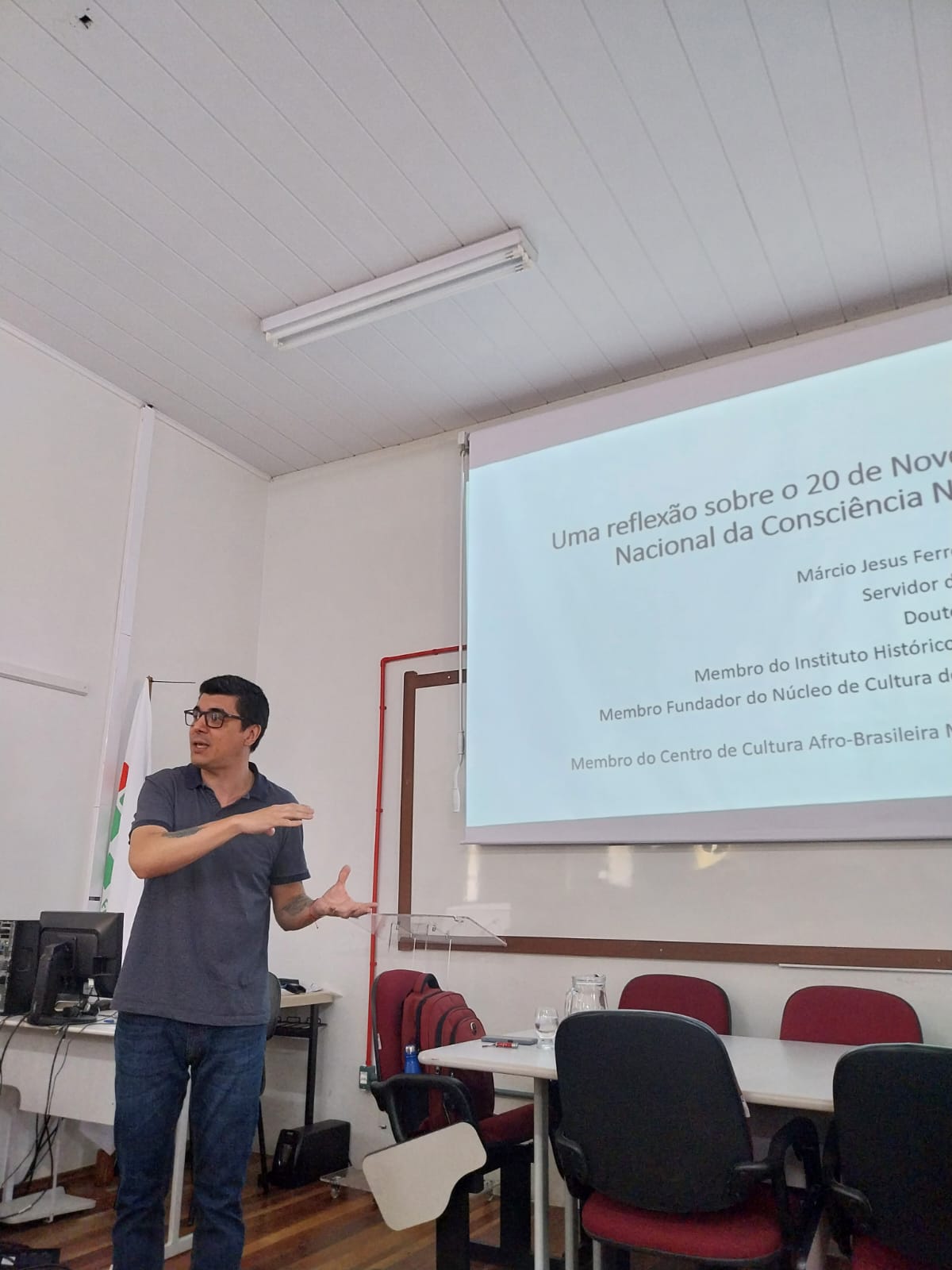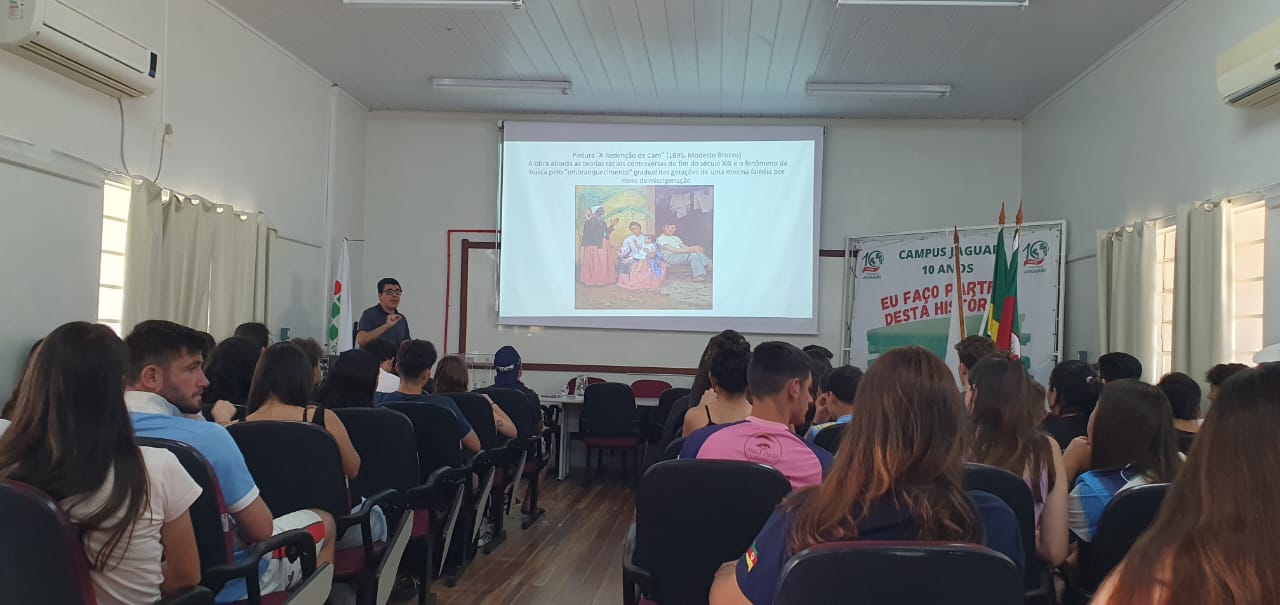 Na quarta-feira, dia 06  de novembro, a CAA e o NEABI do Campus Jaguari iniciaram as atividades alusivas ao 20 de Novembro, Dia da Consciência Negra. Na parte da manhã os alunos dos primeiros e terceiros anos dos cursos técnicos integrados em Agricultura e Sistemas de Energia Renovável participaram da palestra intitulada Uma reflexão sobre o 20 de Novembro (Dia Nacional da Consciência Negra), realizada por Márcio Jesus Ferreira Sônego. À tarde, Sônego realizou uma atividade de formação com os servidores do Campus intitulada Educação para as relações étnico-raciais: a Lei 10.639/03 e a aplicabilidade em sala de aula. Márcio Sônego é historiador, servidor do IFFar Campus Alegrete e doutor em História pela UFSM.