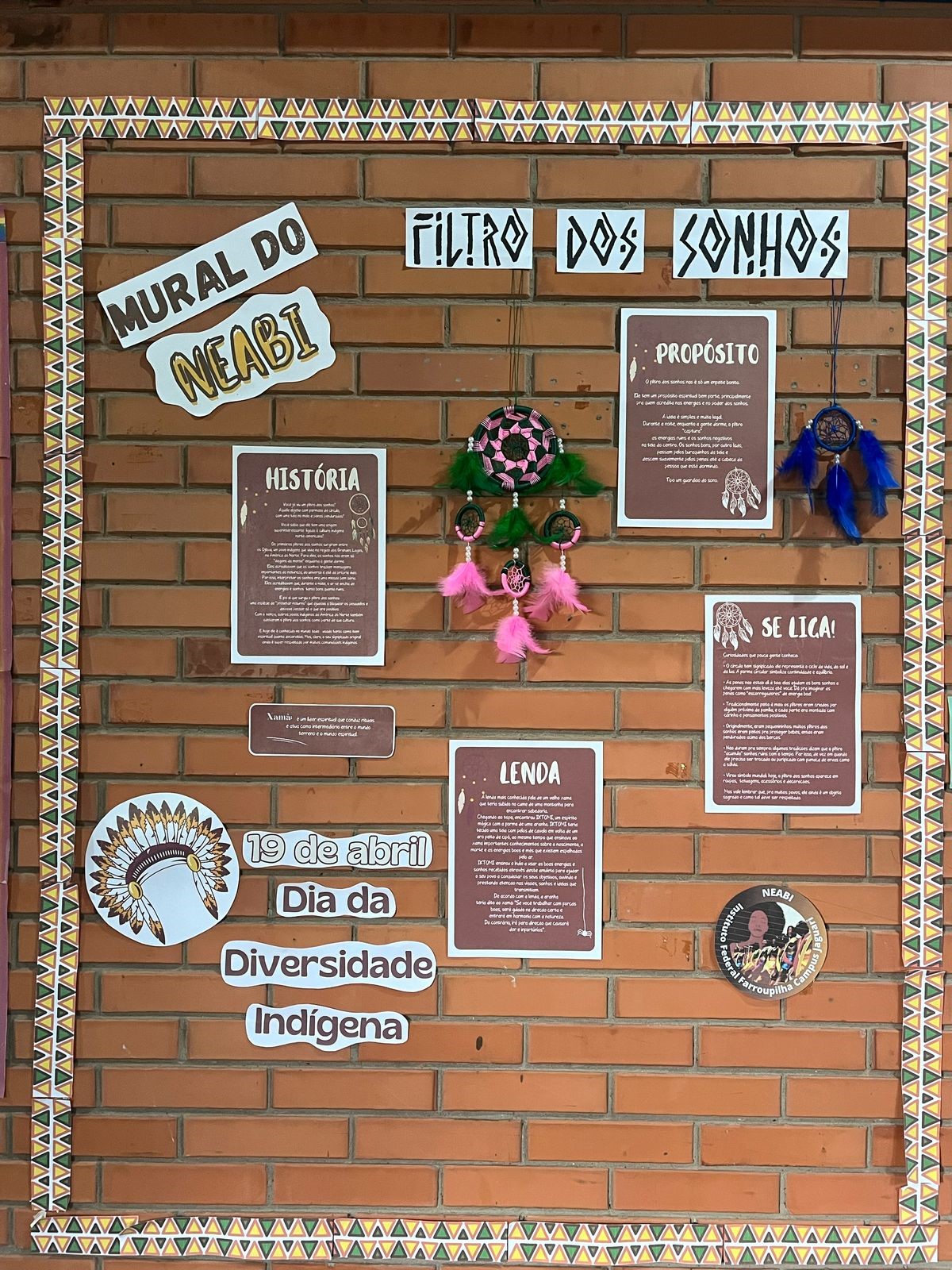 Também em referência a esta data foi elaborado, pelos alunos bolsistas e voluntários do núcleo, um mural que mostra a simbologia e o significado do filtro dos sonhos, um objeto tradicional das culturas indígenas. O mural expôs a história e curiosidades, além de promover o conhecimento sobre a importância desse artefato, que é associado à proteção contra energias negativas e à preservação dos sonhos, além de valorizar a riqueza cultural indígena.