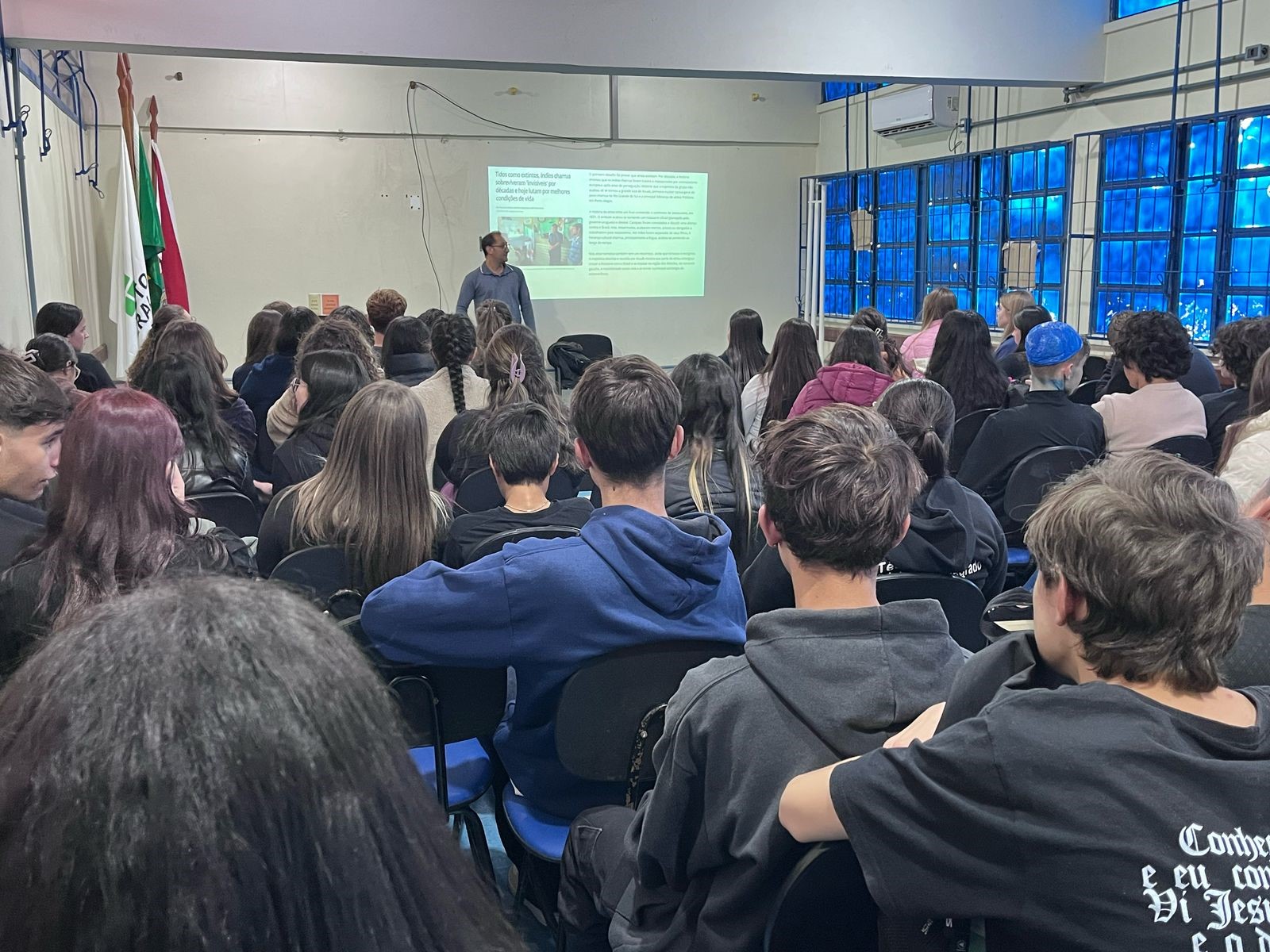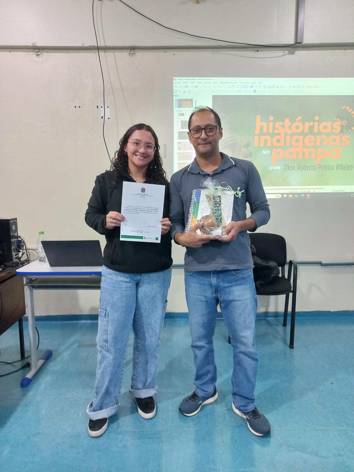 Finalizando as ações, no dia 28 de abril, foi promovida a palestra “Histórias Indígenas no Pampa”, ministrada pelo historiador Max Roberto Pereira Ribeiro. Esta atividade, que ocorreu no Centro de Referência - Santiago para as turmas do Curso Técnico Integrado em Administração, promoveu reflexões sobre a presença e os saberes dos povos indígenas na região sul, reforçando a importância da valorização e do reconhecimento das culturas originárias.