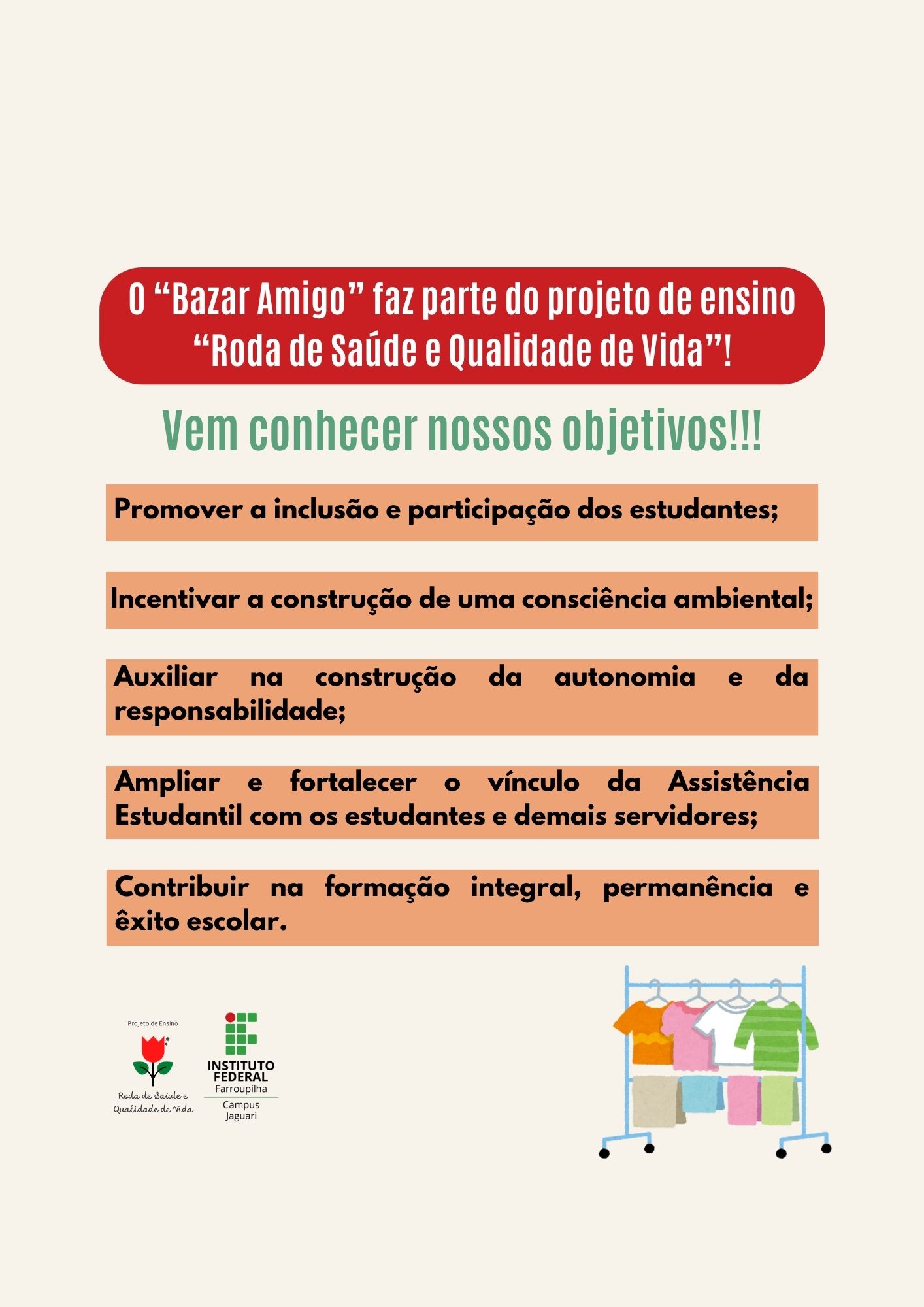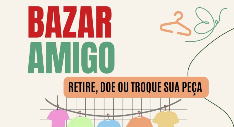 "O Bazar Amigo é uma iniciativa do Projeto Roda de Saúde e Qualidade de Vida, com a participação ativa dos servidores da CAE e dos bolsistas do projeto. A ação promove a troca e retirada de roupas, incentivando práticas sustentáveis, fortalecendo os laços comunitários e estimulando a solidariedade.