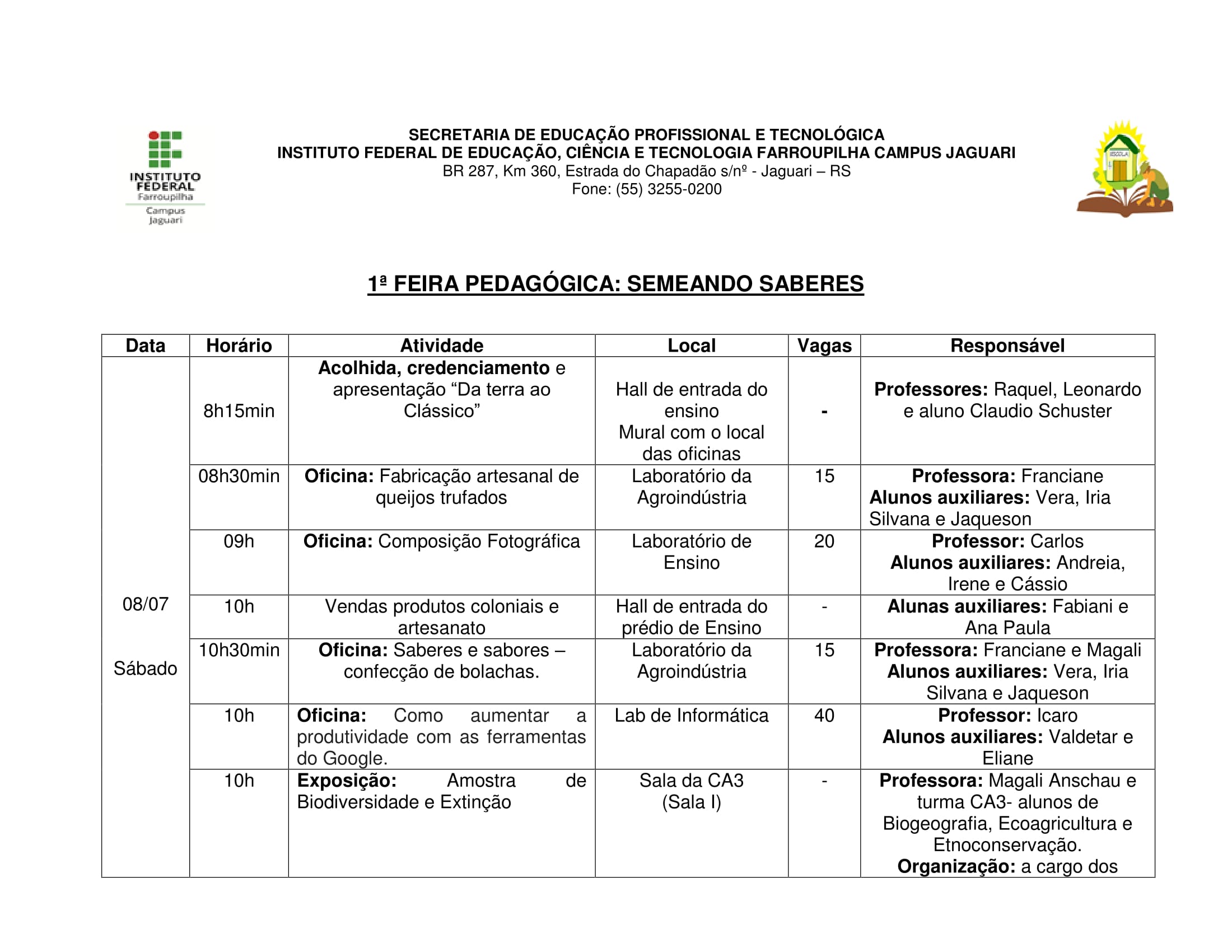 A 1ª Feira Pedagógica do Campus Jaguari será realizada no 08 de julho de 2017. O evento é promovido pelo curso de Licenciatura em Educação do Campo: Ciências Agrárias e Ciências da Natureza.