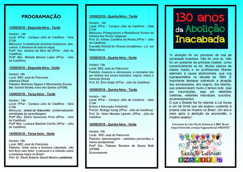Estão abertas até dia 12, as inscrições para a VIII Jornada de Educação e Cultura Afro- Brasileira e Indígena VI Curso de Educação Inclusiva e Diversidade. O evento é uma promoção da Coordenação de Ações Inclusivas do Campus Júlio de Castilhos, através do NEABI, NAPNE e NUGEDIS, em parceria com a Sociedade Cultural e Recretiva José do Patrocínio.sob a coordenação do professor Aristeu Castilhos da Rocha. As inscrições podem ser feitas através do link:http://eventos.jc.iffarroupilha.edu.br/8-neabi.php.